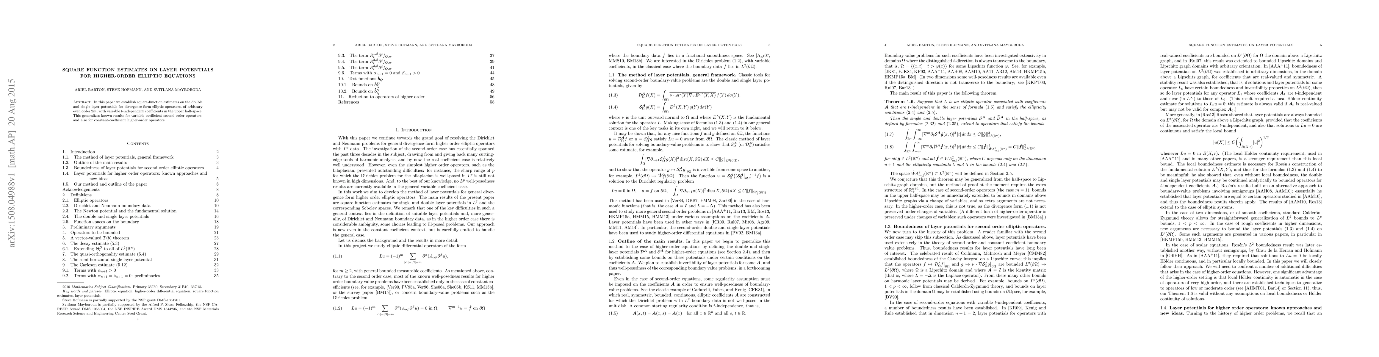 This paper establishes square-function estimates for double and single layer potentials associated with higher-order elliptic operators of arbitrary even order, featuring variable but t-independent coefficients in the upper half-space. It generalizes existing results for both second-order variable-coefficient and constant-coefficient higher-order operators.