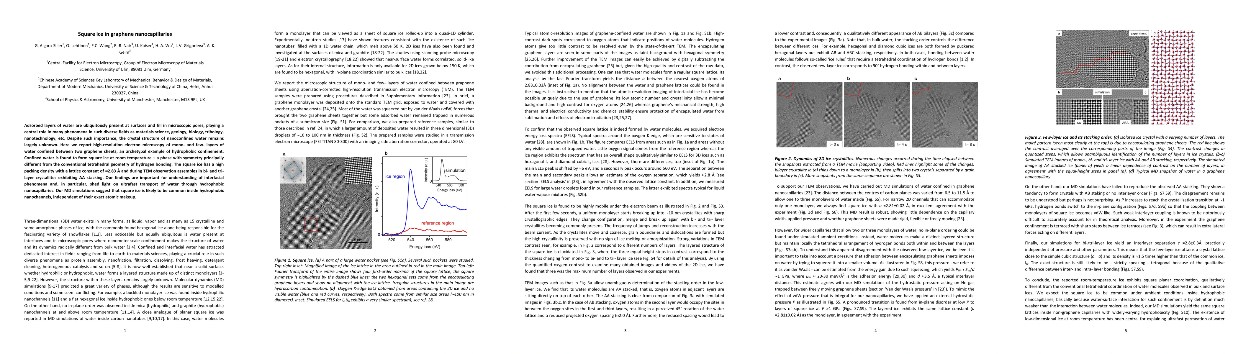 This study reveals that water confined between graphene sheets forms a square ice phase at room temperature, differing from conventional tetrahedral hydrogen bonding. This high-density structure, observed via high-resolution electron microscopy, has implications for understanding interfacial phenomena and water transport in hydrophobic nanocapillaries.