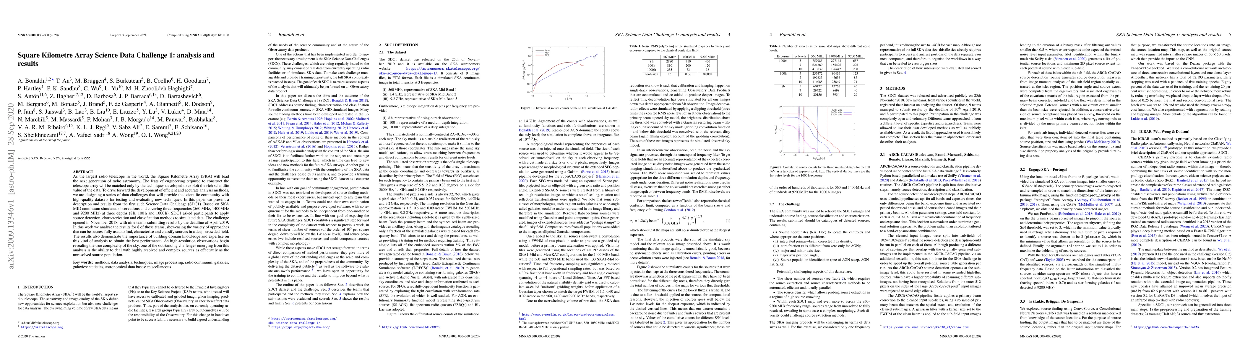 This paper details the first Science Data Challenge (SDC1) for the Square Kilometre Array (SKA), focusing on source detection and characterization in simulated radio astronomy data. Nine teams submitted results, and the analysis of eight teams highlights diverse successful methods and underscores the necessity of domain expertise for optimal performance.