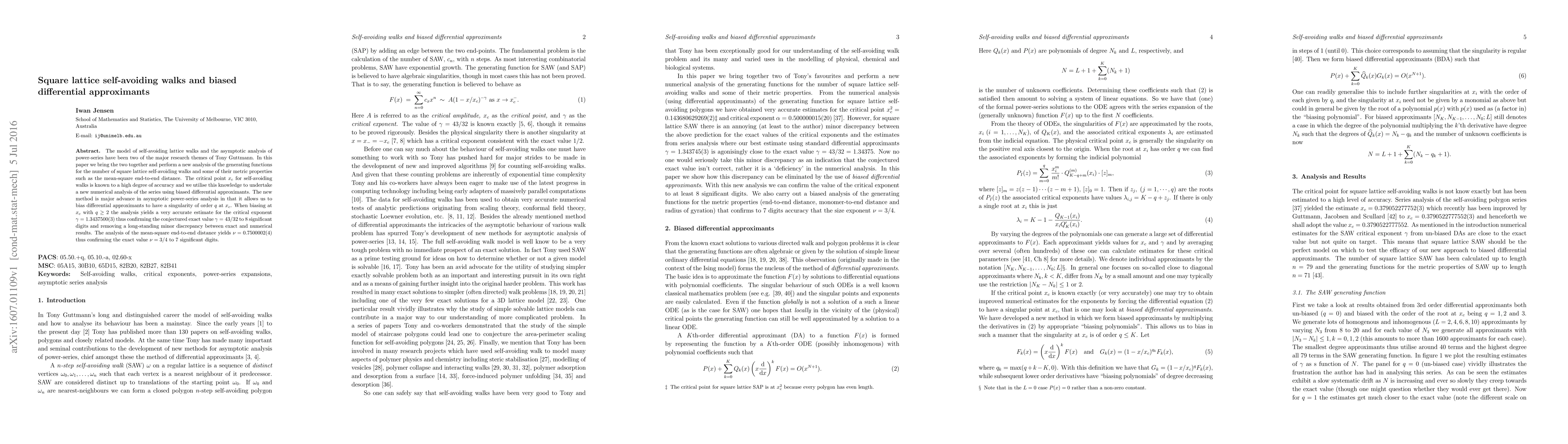 This paper combines self-avoiding lattice walks and asymptotic power-series analysis, utilizing biased differential approximants to achieve highly accurate estimates for critical exponents and mean-square end-to-end distances, confirming long-standing conjectures with 8 and 7 significant digits respectively.