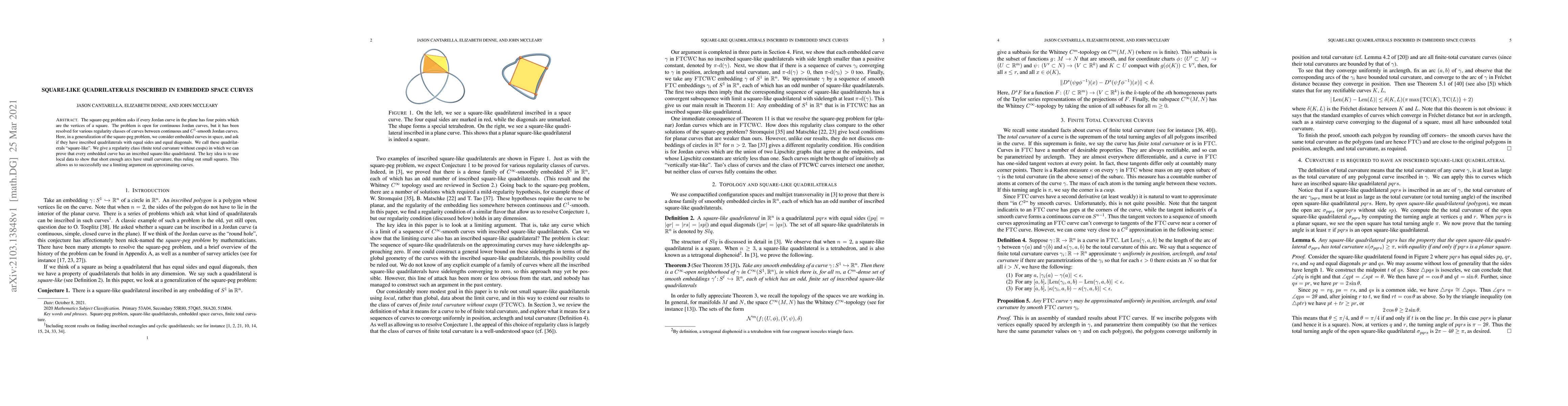 The square-peg problem asks if every Jordan curve in the plane has four points which are the vertices of a square. The problem is open for continuous Jordan curves, but it has been resolved for various regularity classes of curves between continuous and $C^1$-smooth Jordan curves. Here, in a generalization of the square-peg problem, we consider embedded curves in space, and ask if they have inscribed quadrilaterals with equal sides and equal diagonals. We call these quadrilaterals "square-like". We give a regularity class (finite total curvature without cusps) in which we can prove that every embedded curve has an inscribed square-like quadrilateral. The key idea is to use local data to show that short enough arcs have small curvature, thus ruling out small squares. This allows us to successfully use a limiting argument on approximating curves.