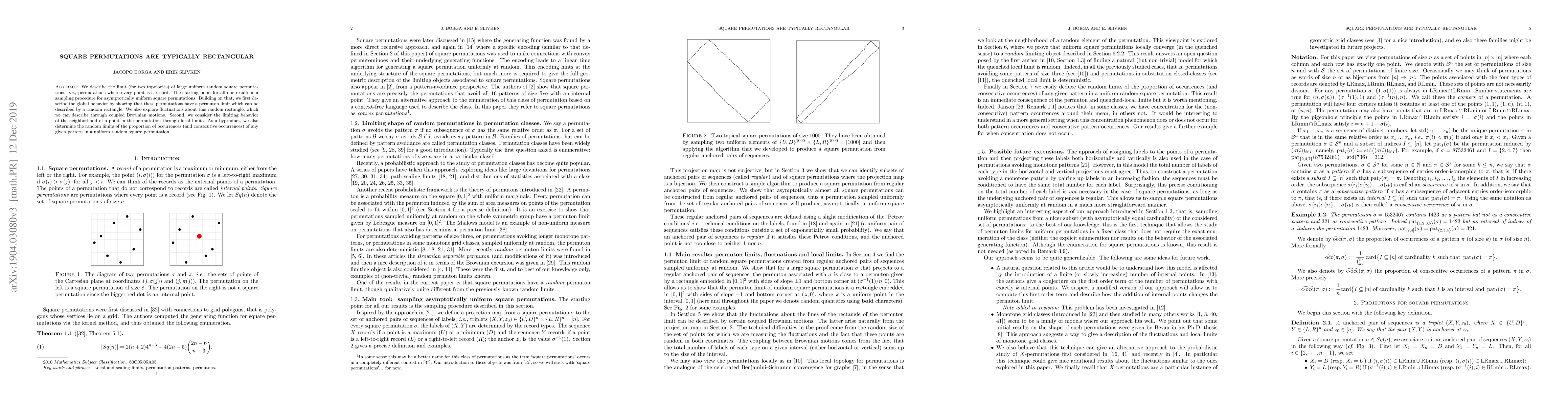 This paper investigates the behavior of large uniform random square permutations, revealing that they converge to a permuton limit described by a random rectangle. The study also explores fluctuations around this rectangle and local limits, determining the random limits of pattern occurrences in these permutations.