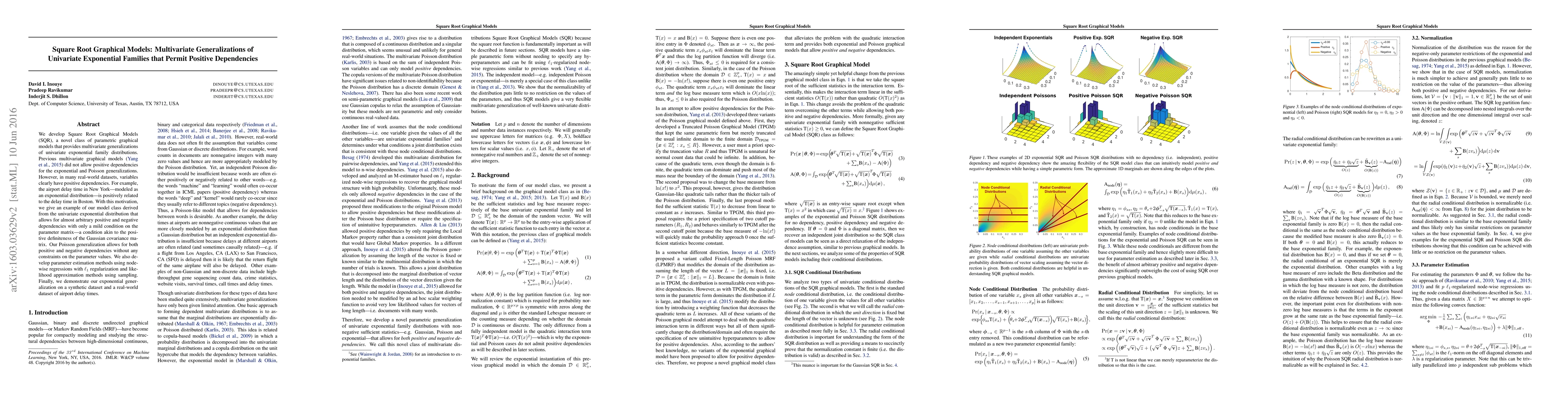 This paper introduces Square Root Graphical Models (SQR), a new class of parametric graphical models that generalizes univariate exponential families to multivariate distributions, allowing for both positive and negative dependencies. The authors provide parameter estimation methods and demonstrate the model's effectiveness on synthetic and real-world airport delay datasets.