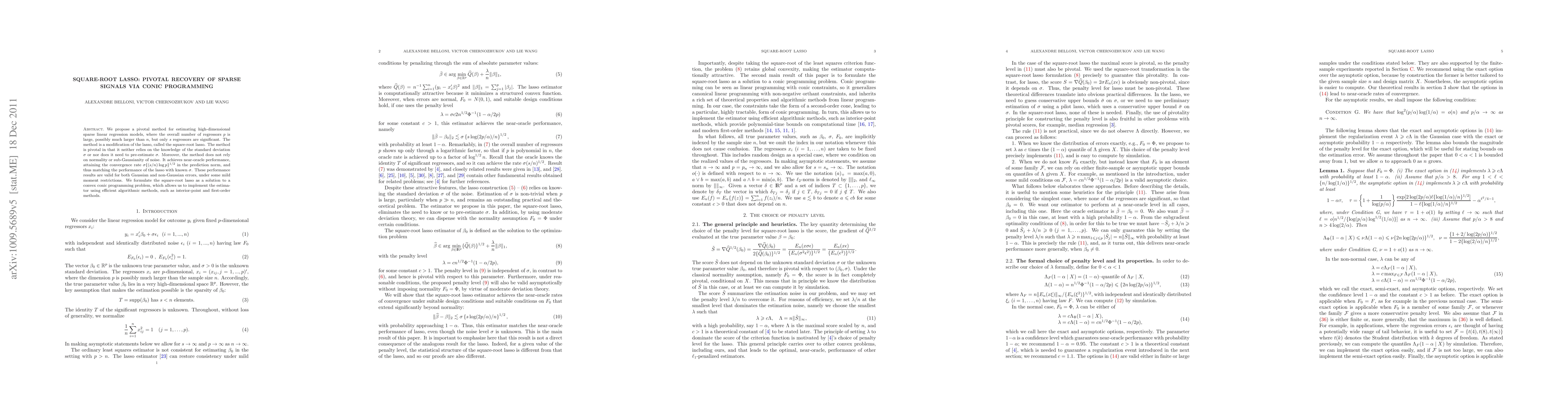 The paper introduces the square-root lasso, a method for estimating high-dimensional sparse linear regression models without requiring knowledge of the noise standard deviation. It achieves near-oracle performance and is implemented via convex conic programming.