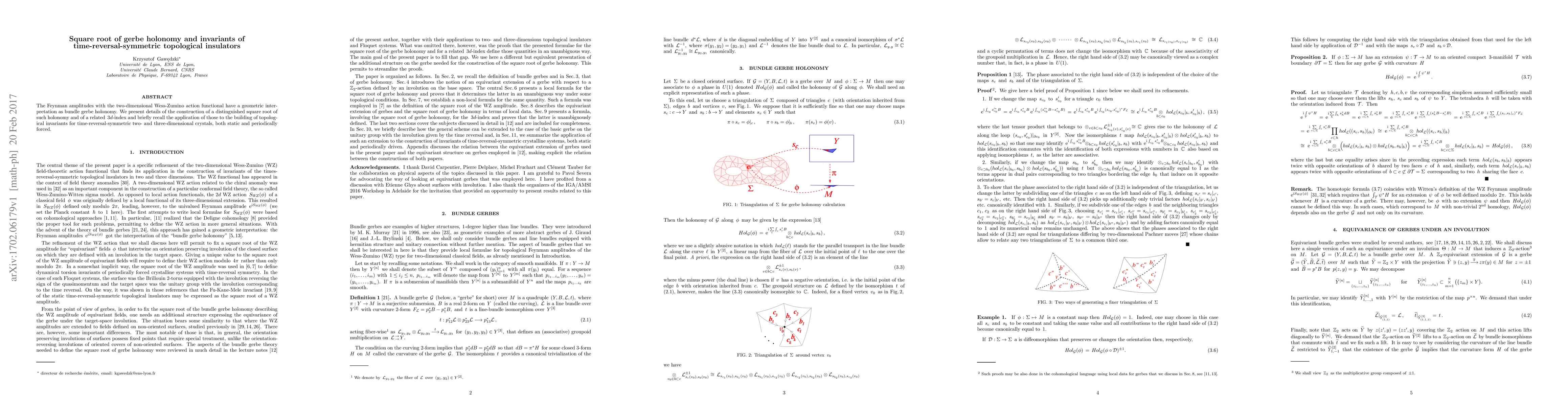 The Feynman amplitudes with the two-dimensional Wess-Zumino action functional have a geometric interpretation as bundle gerbe holonomy. We present details of the construction of a distinguished square root of such holonomy and of a related 3d-index and briefly recall the application of those to the building of topological invariants for time-reversal-symmetric two- and three-dimensional crystals, both static and periodically forced.