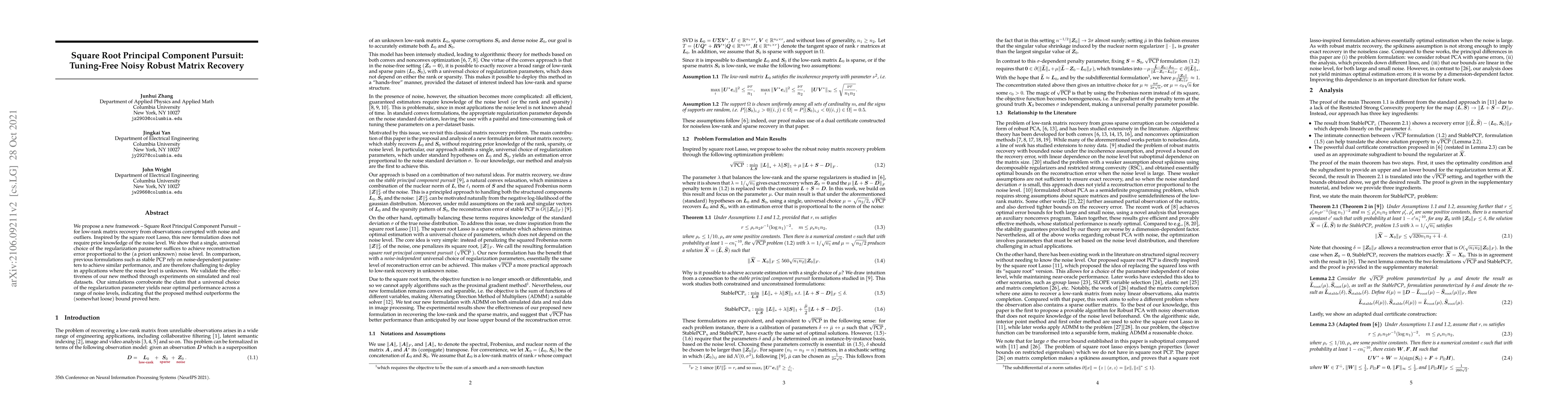 The paper introduces Square Root Principal Component Pursuit (SRPCP) for robust low-rank matrix recovery from noisy and outlier-corrupted data, eliminating the need for noise level knowledge. A single, universal regularization parameter suffices for optimal performance across varying noise levels, outperforming previous methods that require noise-specific parameters.