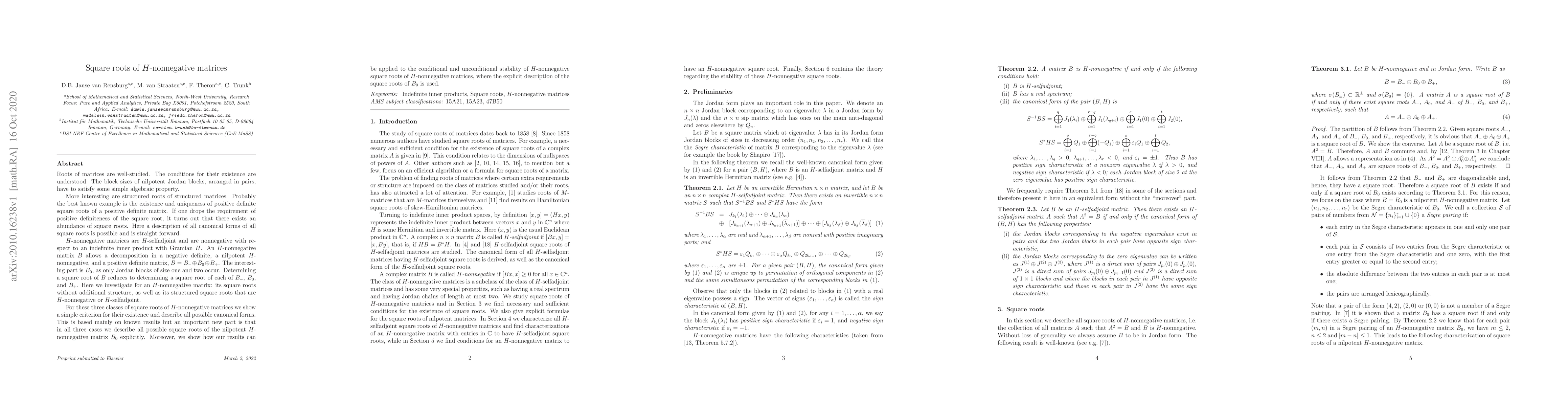 Roots of matrices are well-studied. The conditions for their existence are understood: The block sizes of nilpotent Jordan blocks, arranged in pairs, have to satisfy some simple algebraic property. More interesting are structured roots of structured matrices. Probably the best known example is the existence and uniqueness of positive definite square roots of a positive definite matrix. If one drops the requirement of positive definiteness of the square root, it turns out that there exists an abundance of square roots. Here a description of all canonical forms of all square roots is possible and is straight forward. H-nonnegative matrices are H-selfadjoint and are nonnegative with respect to an indefinite inner product with Gramian H. An H-nonnegative matrix $B$ allows a decomposition in a negative definite, a nilpotent H-nonnegative, and a positive definite matrix, B=B_- \oplus B_0 \oplus B_+. The interesting part is B_0, as only Jordan blocks of size one and two occur. Determining a square root of B reduces to determining a square root of each of B_-, B_0, and B_+. Here we investigate for an H-nonnegative matrix: its square roots without additional structure, as well as its structured square roots that are H-nonnegative or H-selfadjoint. For these three classes of square roots of H-nonnegative matrices we show a simple criterion for their existence and describe all possible canonical forms. This is based mainly on known results but an important new part is that in all three cases we describe all possible square roots of the nilpotent H-nonnegative matrix B_0 explicitly. Moreover, we show how our results can be applied to the conditional and unconditional stability of H-nonnegative square roots of H-nonnegative matrices, where the explicit description of the square roots of B_0 is used.