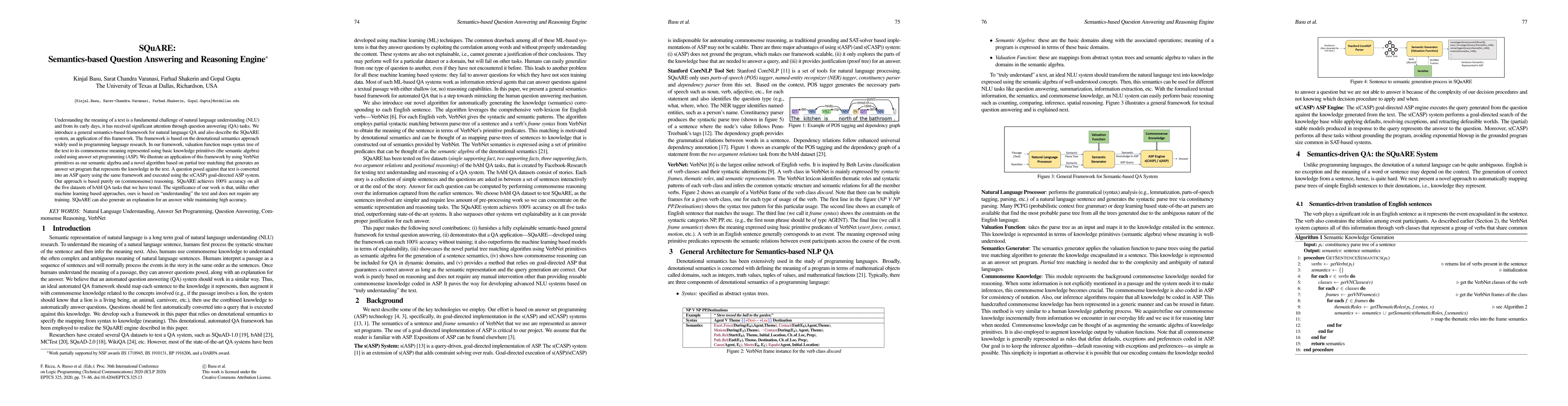 SQuARE is a semantics-based framework for natural language question answering that maps text syntax to commonsense meaning using a valuation function and answer set programming. Unlike machine learning approaches, SQuARE achieves 100% accuracy on bAbI QA tasks by purely understanding the text without training, and can generate explanations for answers.
