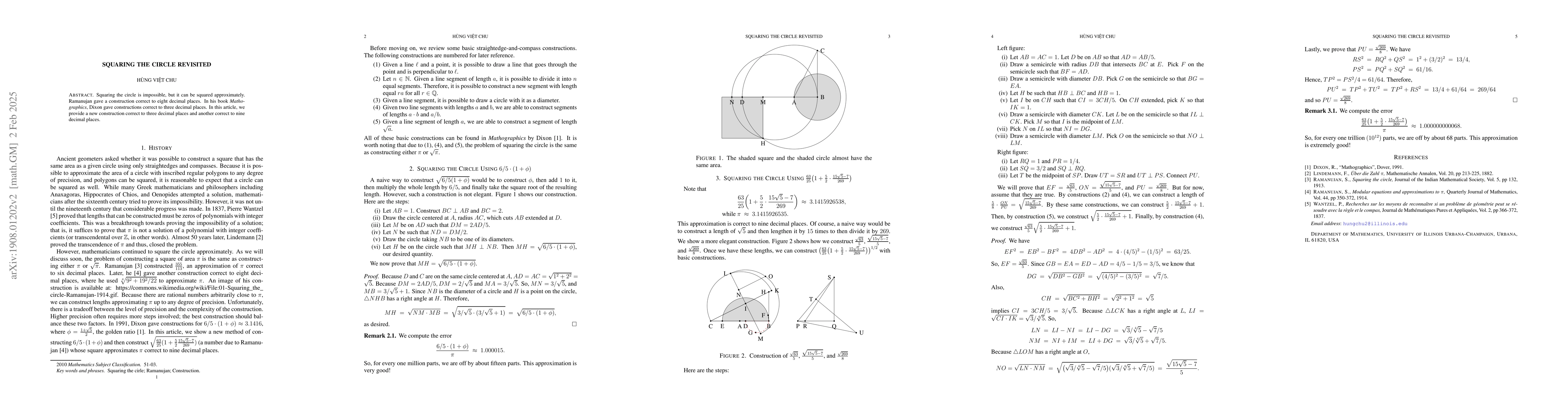 Since squaring the circle was proved to be impossible, mathematicians have picked up a new hobby to square the circle 'approximately'. The most famous work is due to Ramanujan who gave a construction correct to $8$ decimal places. In his book Mathographics, Dixon gave constructions correct to $3$ decimal places and stated that his method was quite complicated. In this paper, we improve Dixon's method then give a new construction correct to $9$ decimal places, a new record so far.