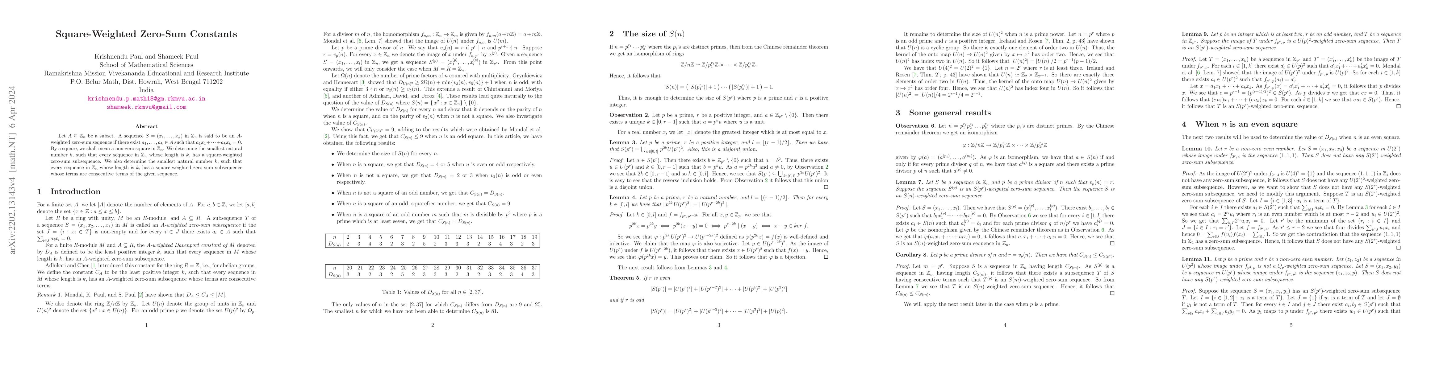 Summary: This paper investigates the smallest sequence length $k$ ensuring every sequence in $\mathbb{Z}_n$ contains a subsequence with a zero-sum weighted by squares from a subset $A$, and specifically, a consecutive subsequence meeting this criterion.