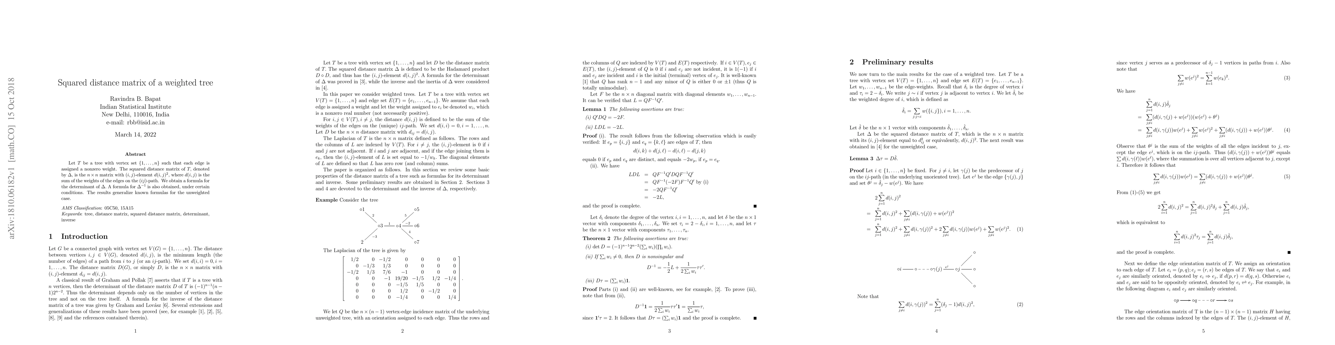 This paper derives a formula for the determinant of the squared distance matrix $\Delta$ of a weighted tree $T$ and provides a formula for its inverse $\Delta^{-1}$ under specific conditions. The results extend known formulas for unweighted trees.