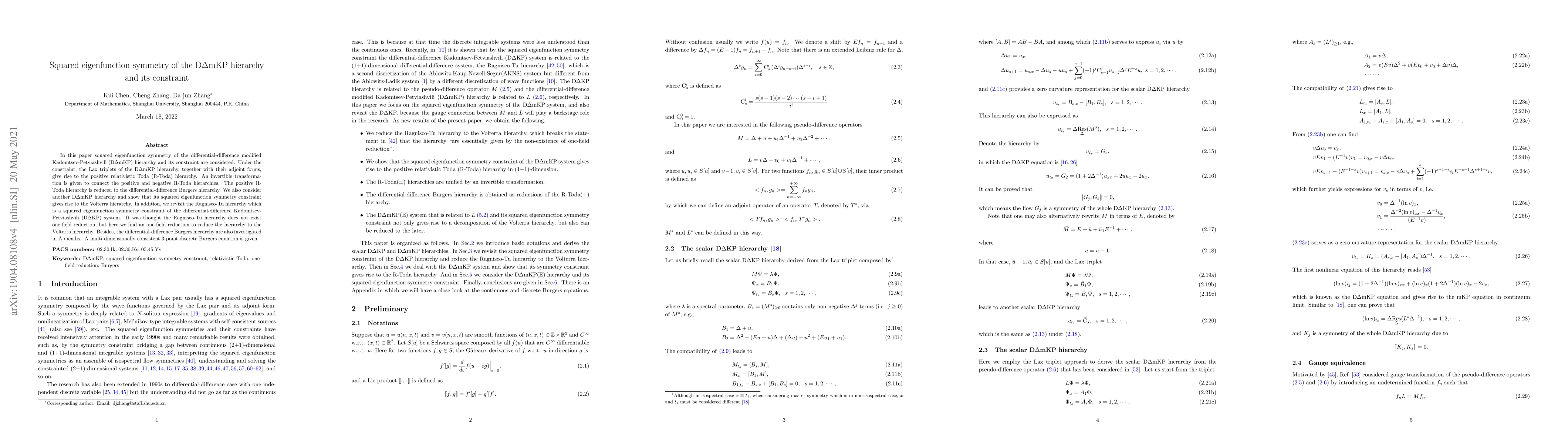 This paper explores the squared eigenfunction symmetry of the D$\Delta$mKP hierarchy and its constraints, revealing connections to the positive R-Toda and Volterra hierarchies. It also uncovers a one-field reduction of the Ragnisco-Tu hierarchy to the Volterra hierarchy and investigates the differential-difference Burgers hierarchy.