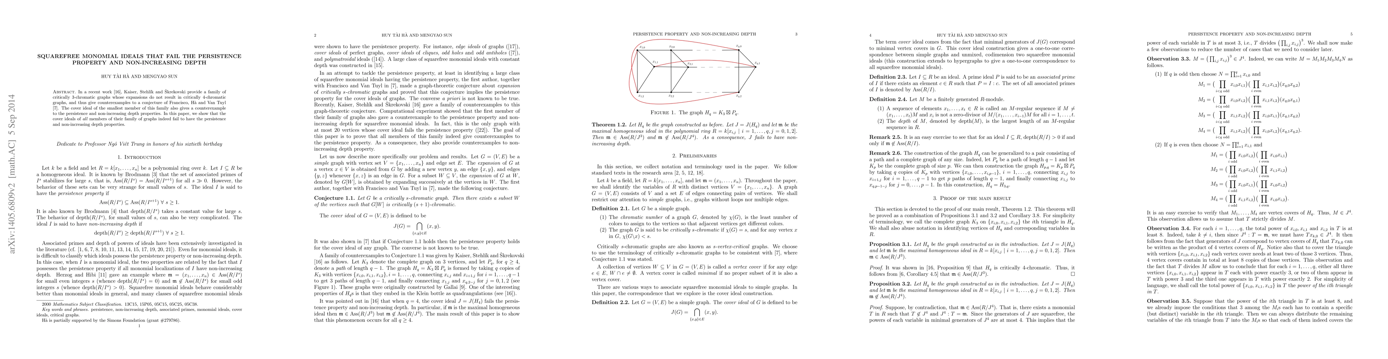 Title: Squarefree monomial ideals that fail the persistence property and non-increasing depth Summary: This paper demonstrates that the cover ideals of a family of critically 3-chromatic graphs, initially shown to contradict a conjecture by Francisco, Ha, and Van Tuyl, also fail to exhibit the persistence and non-increasing depth properties.