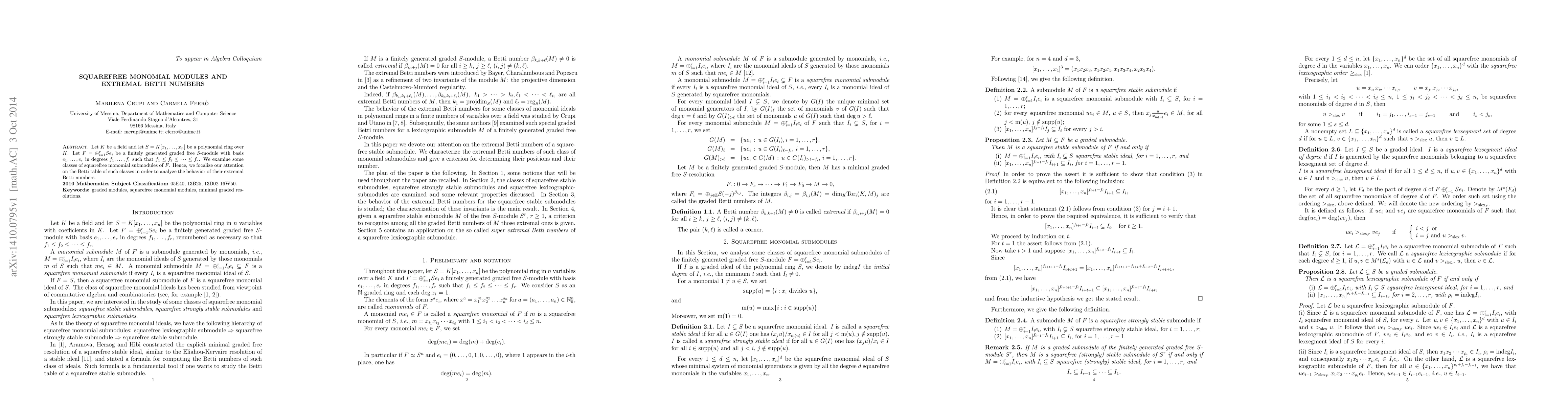 Summary: This research explores squarefree monomial submodules within finitely generated graded free modules over polynomial rings, focusing on the structure of their Betti tables and the characteristics of their extremal Betti numbers.