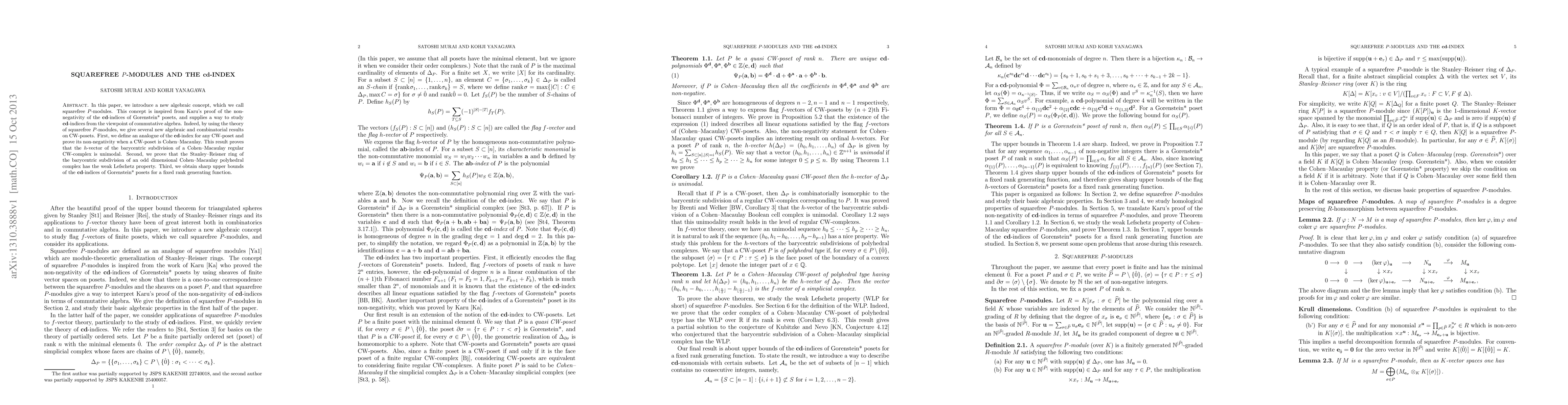 In this paper, we introduce a new algebraic concept, which we call squarefree P-modules. This concept is inspired from Karu's proof of the non-negativity of the cd-indices of Gorenstein* posets, and supplies a way to study cd-indices from the viewpoint of commutative algebra. Indeed, by using the theory of squarefree P-modules, we give several new algebraic and combinatorial results on CW-posets. First, we define an analogue of the cd-index for any CW-poset and prove its non-negativity when a CW-poset is Cohen-Macaulay. This result proves that the h-vector of the barycentric subdivision of a Cohen-Macaulay regular CW-complex is unimodal. Second, we prove that the Stanley-Reisner ring of the barycentric subdivision of an odd dimensional Cohen-Macaulay polyhedral complex has the weak Lefschetz property. Third, we obtain sharp upper bounds of the cd-indices of Gorenstein* posets for a fixed rank generating function.