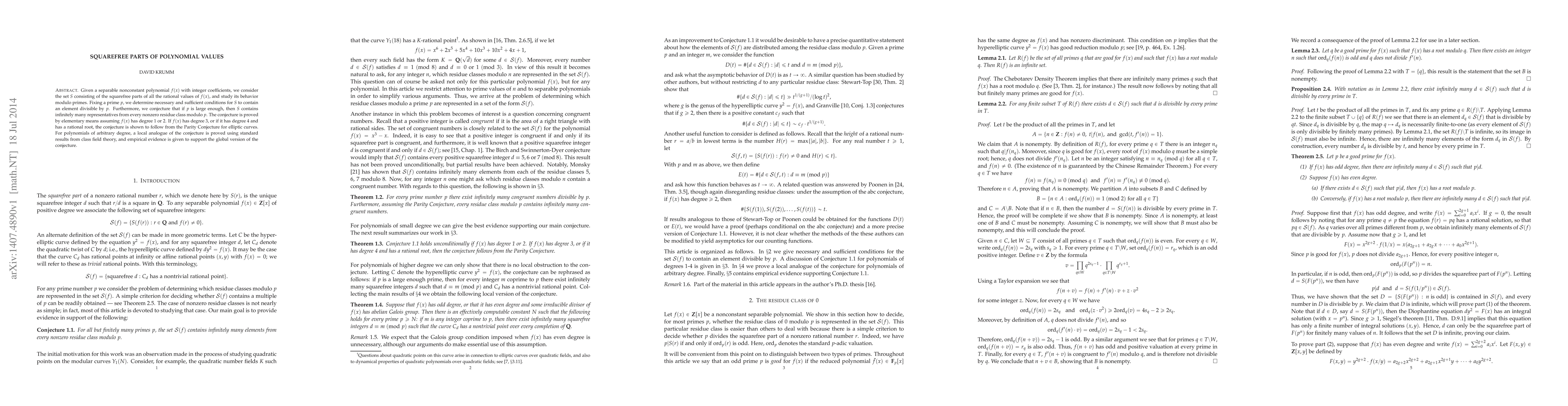 This paper explores the squarefree parts of rational values taken by a separable polynomial with integer coefficients, focusing on their distribution modulo primes. It proves a conjecture regarding the infinite presence of these parts in every nonzero residue class modulo large primes for polynomials of degree 1 or 2, and extends this for higher degrees using elliptic curves and class field theory.