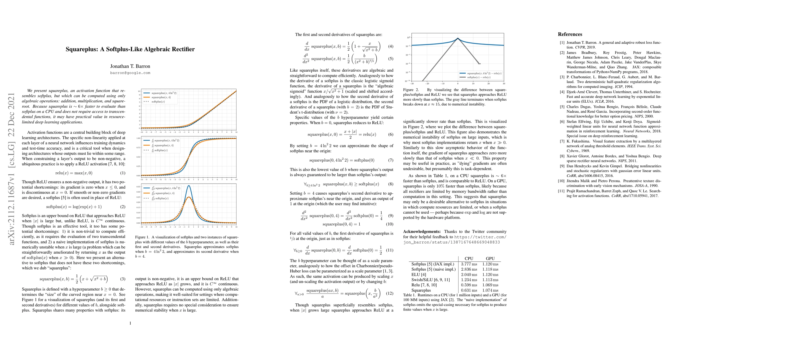 Summary: Squareplus is a novel activation function similar to softplus but computed via algebraic operations, offering faster evaluation (~6x) and practical value in resource-constrained environments without needing transcendental functions.