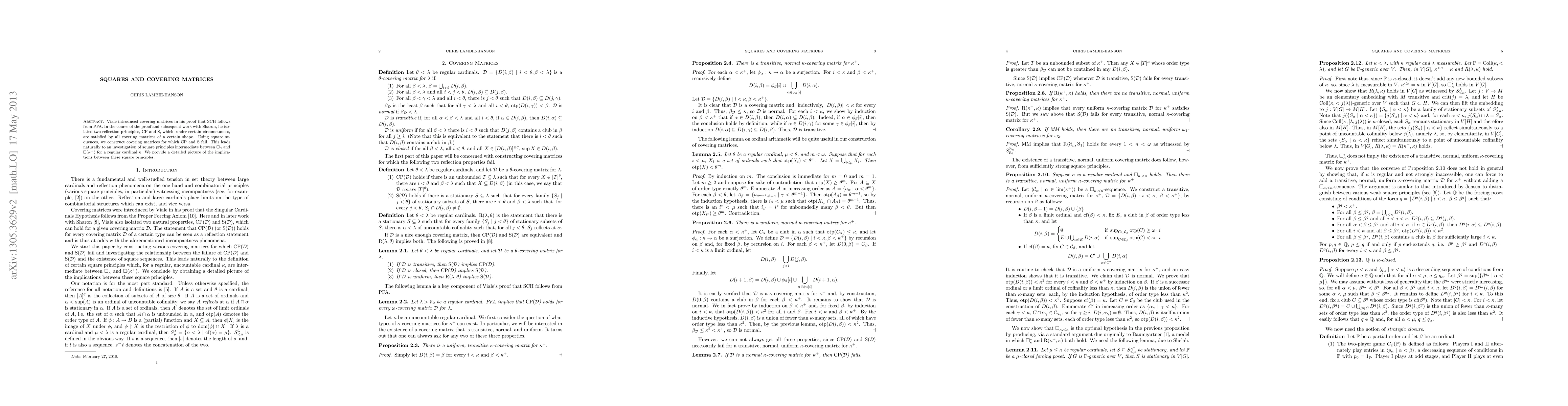 Researchers investigated square principles between covering matrices, finding that some principles fail under specific constructions while others hold; they provide a detailed picture of the implications between these principles.