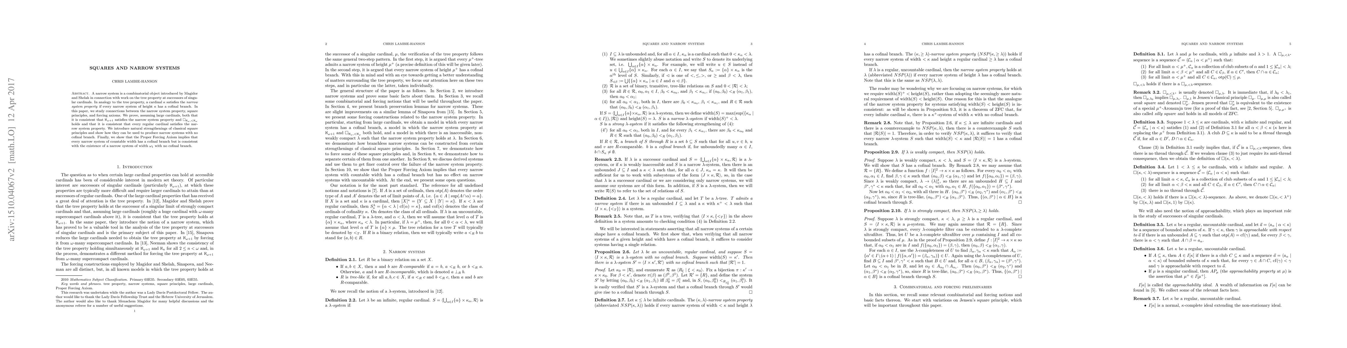 This paper explores connections between the narrow system property, square principles, and forcing axioms, showing that certain large cardinal assumptions imply consistency of the narrow system property for specific cardinals.
