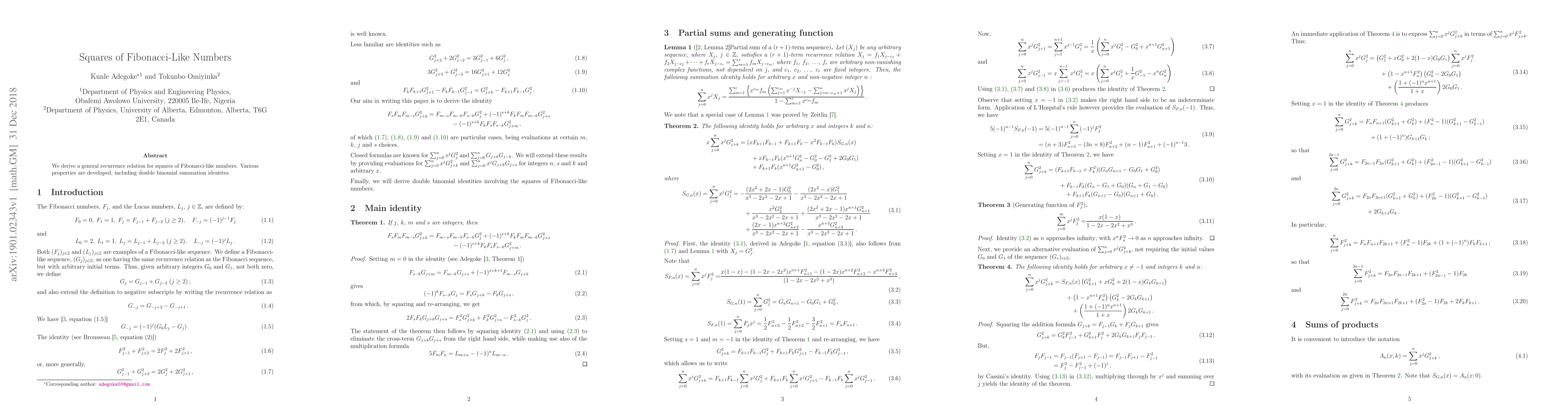 This paper establishes a recurrence relation for the squares of Fibonacci-like numbers and explores their properties, including the development of double binomial summation identities.