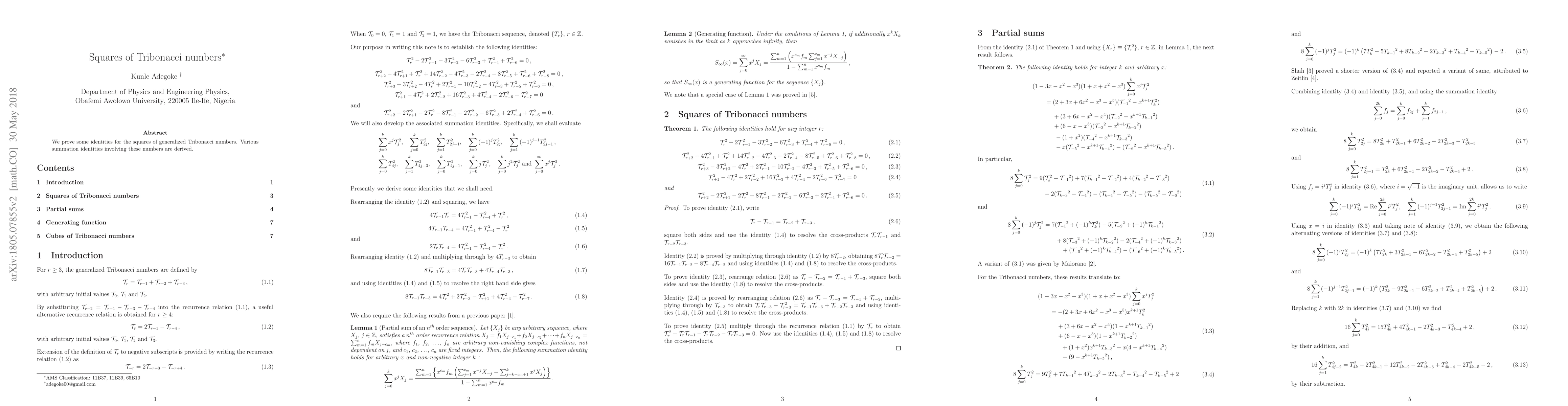Summary: This paper proves identities for the squares of generalized Tribonacci numbers and derives several summation identities involving these numbers, contributing to the understanding of their algebraic properties.