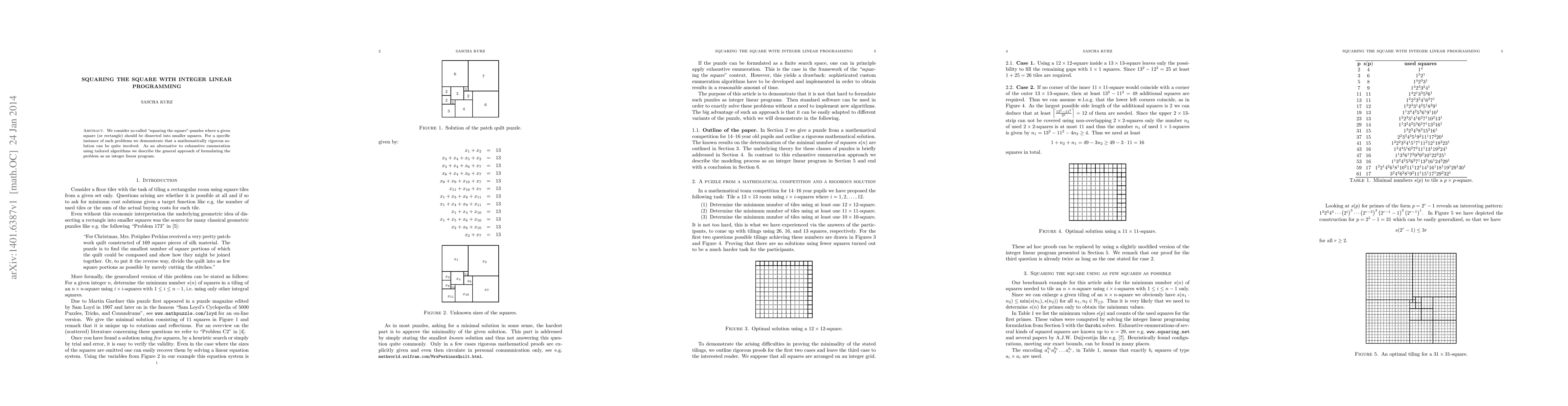 This paper explores solving the "squaring the square" puzzle—dissecting a square into smaller squares—using integer linear programming as an alternative to traditional exhaustive algorithms. The authors demonstrate the effectiveness of this mathematical approach for a specific instance of the problem.