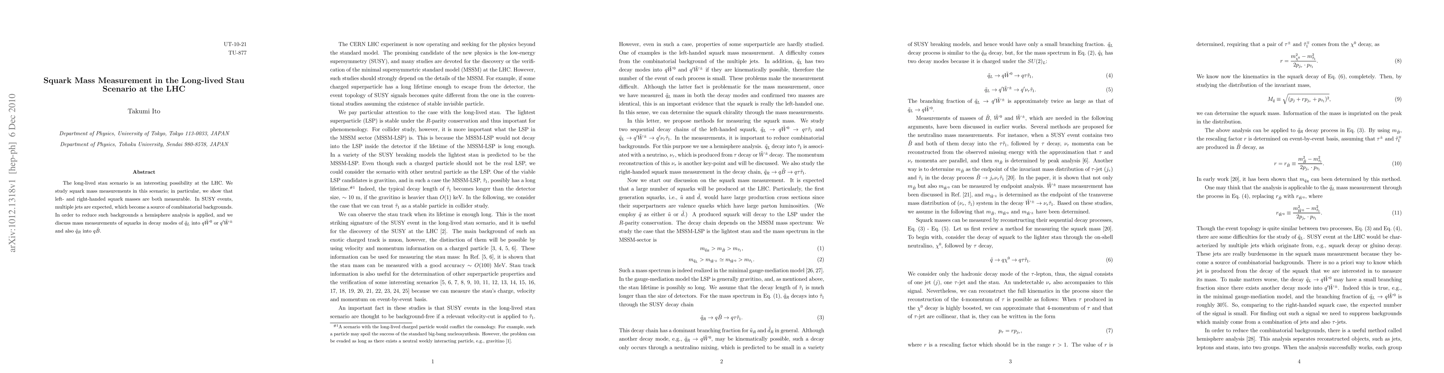 This paper investigates the measurement of squark masses in the long-lived stau scenario at the LHC, demonstrating that both left- and right-handed squark masses can be determined. To mitigate combinatorial backgrounds from SUSY events, a hemisphere analysis is employed, focusing on decay modes for left-handed squarks into quark + neutral/charged Wino and right-handed squarks into quark + Bino.