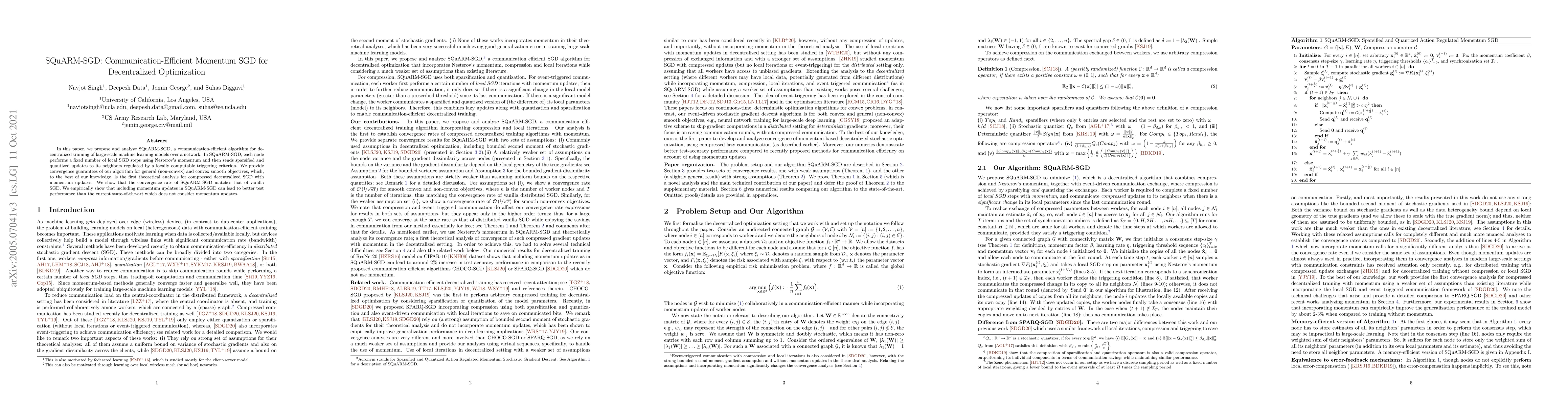SQuARM-SGD is a communication-efficient decentralized optimization algorithm that uses Nesterov's momentum and sparsifies/quantizes updates, achieving comparable convergence rates to vanilla SGD while outperforming non-momentum-based methods on test performance. The paper provides theoretical convergence guarantees for both convex and non-convex smooth objectives.