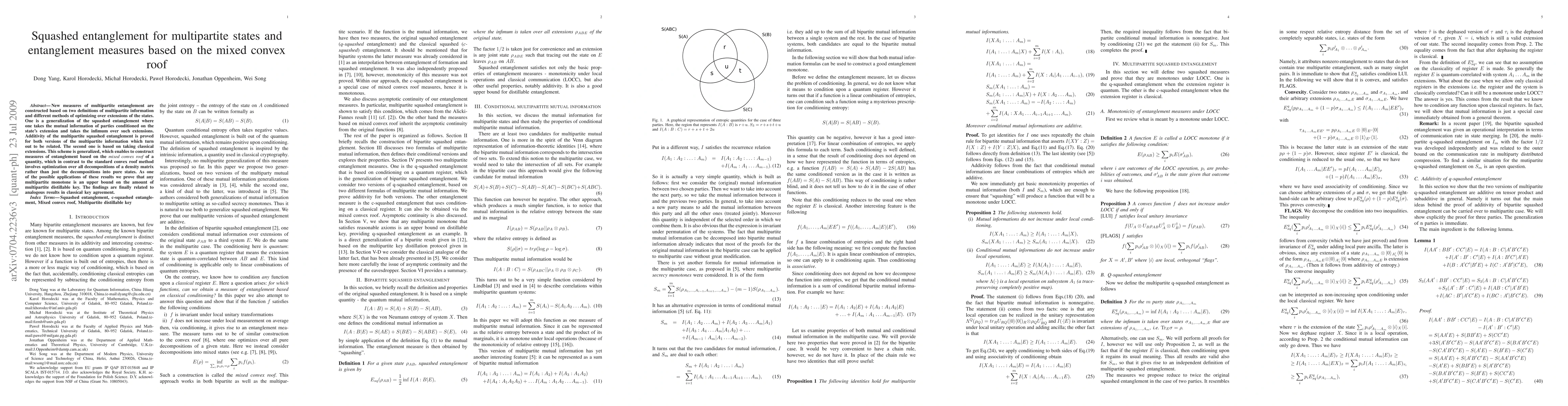 This paper constructs new measures of multipartite entanglement based on squashed entanglement and mixed convex roof methods, proving additivity and showing that multipartite monotones bound distillable key. The results extend classical key agreement concepts to quantum multipartite systems.