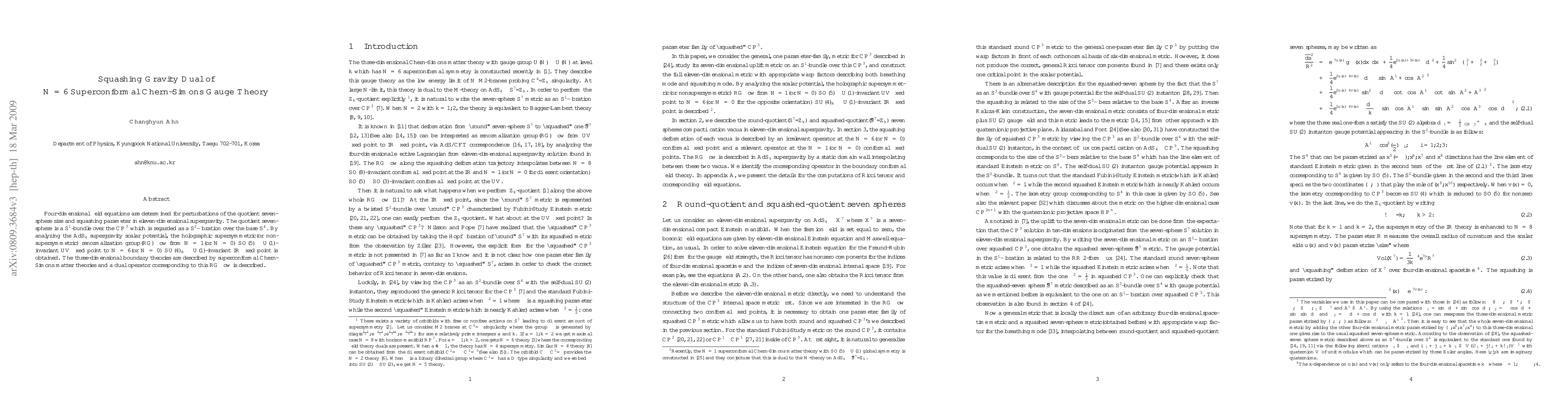 Four-dimensional field equations are determined for perturbations of the quotient seven-sphere size and squashing parameter in eleven-dimensional supergravity. The quotient seven-sphere is a S^1-bundle over the CP^3 which is regarded as a S^2-fibration over the base S^4. By analyzing the AdS_4 supergravity scalar potential, the holographic supersymmetric(or nonsupersymmetric) renormalization group(RG) flow from N=1(or N=0) SO(5) x U(1)-invariant UV fixed point to N=6(or N=0) SU(4)_R x U(1)-invariant IR fixed point is obtained. The three-dimensional boundary theories are described by superconformal Chern-Simons matter theories and a dual operator corresponding to this RG flow is described.