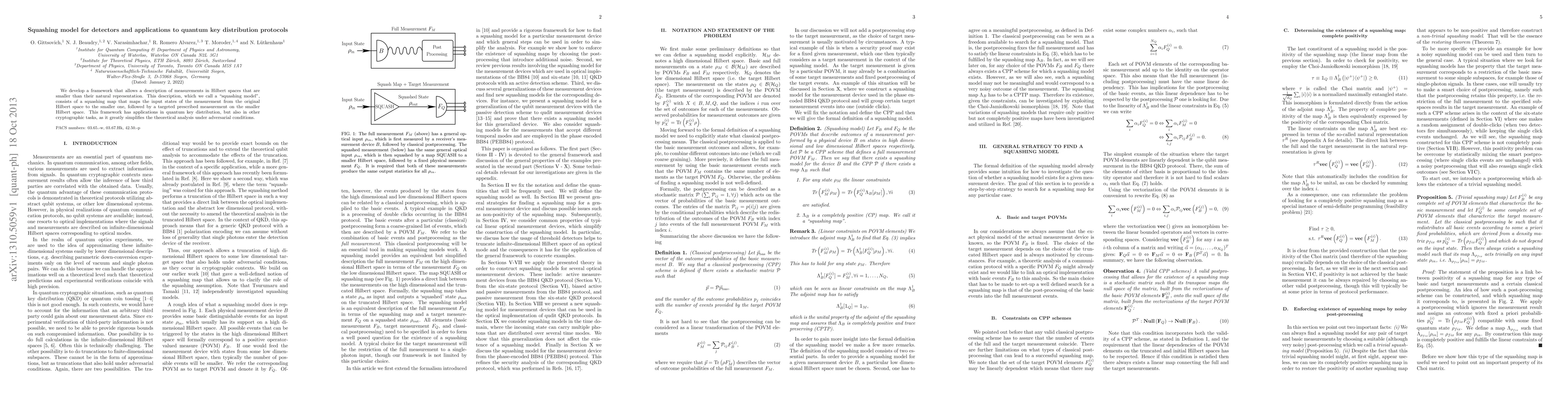 We develop a framework that allows a description of measurements in Hilbert spaces that are smaller than their natural representation. This description, which we call a "squashing model", consists of a squashing map that maps the input states of the measurement from the original Hilbert space to the smaller one, followed by a targeted prescribed measurement on the smaller Hilbert space. This framework has applications in quantum key distribution, but also in other cryptographic tasks, as it greatly simplifies the theoretical analysis under adversarial conditions.