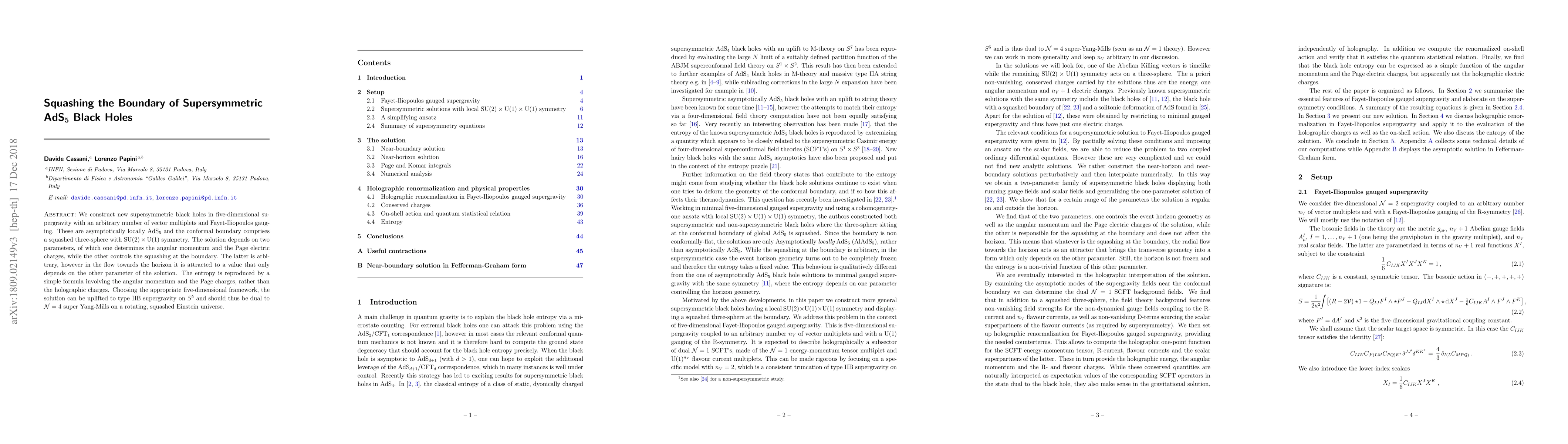 This paper constructs new supersymmetric black holes in five-dimensional supergravity with squashed conformal boundaries, showing that the entropy depends on angular momentum and Page electric charges rather than holographic charges. The solution can be uplifted to type IIB supergravity on $S^5$, suggesting a dual relationship to $\mathcal{N}=4$ super Yang-Mills.