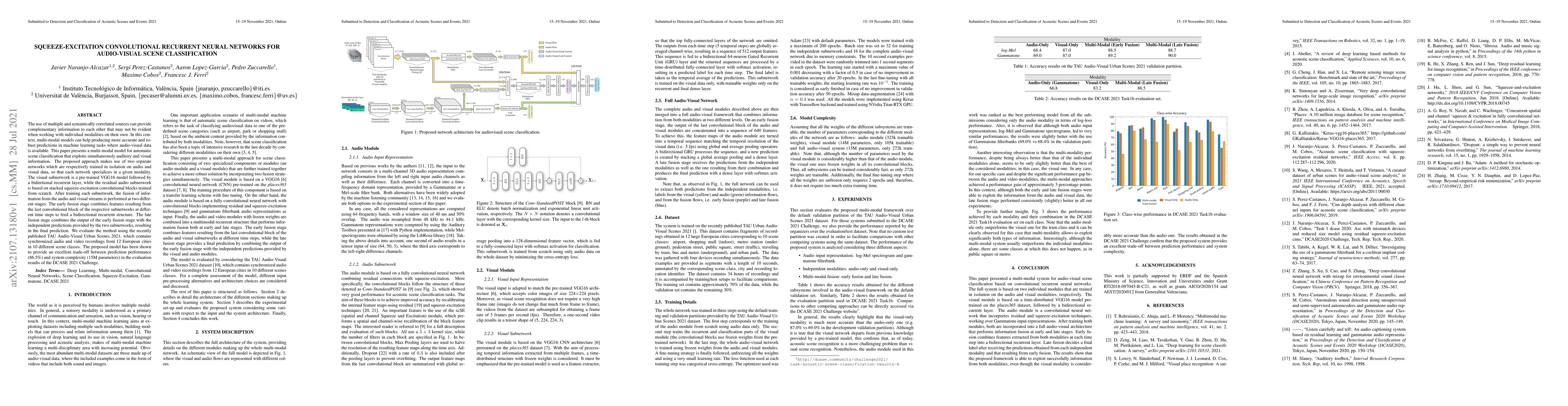 This paper proposes a multi-modal model for audio-visual scene classification that uses separate networks for audio and visual data. The visual network employs a pre-trained VGG16 model with a bidirectional recurrent layer, while the audio network uses squeeze-excitation convolutional blocks. The model combines features at early and late fusion stages to achieve high accuracy (86.5%) with manageable complexity (15M parameters).