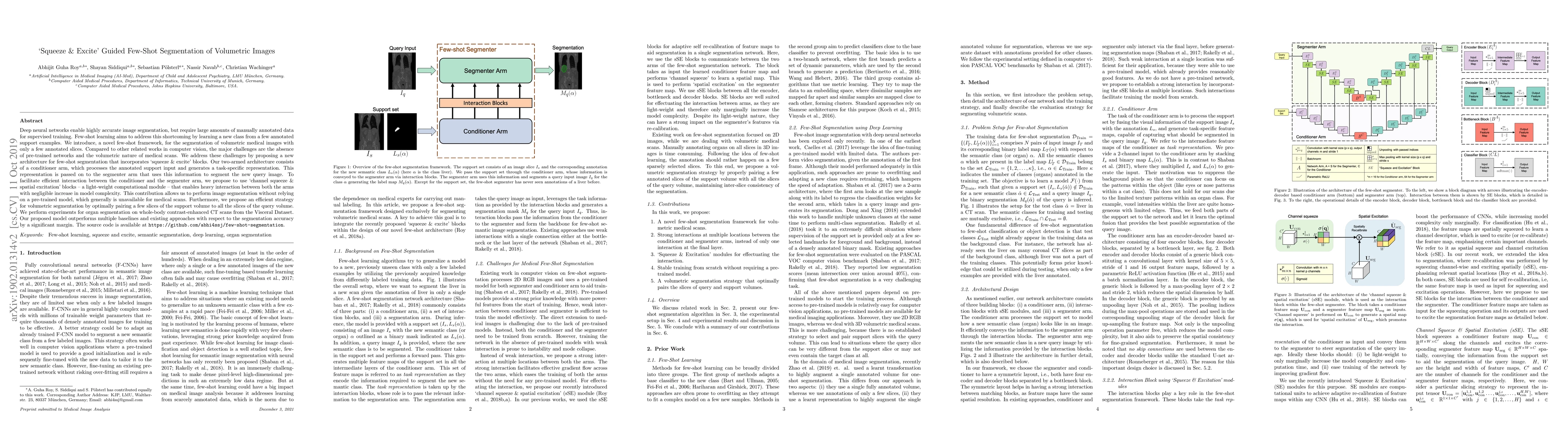 This paper introduces a novel few-shot segmentation framework for volumetric medical images using a two-armed architecture with 'squeeze & excite' blocks, enabling segmentation with minimal annotated data. The proposed method outperforms existing approaches on organ segmentation in whole-body CT scans.