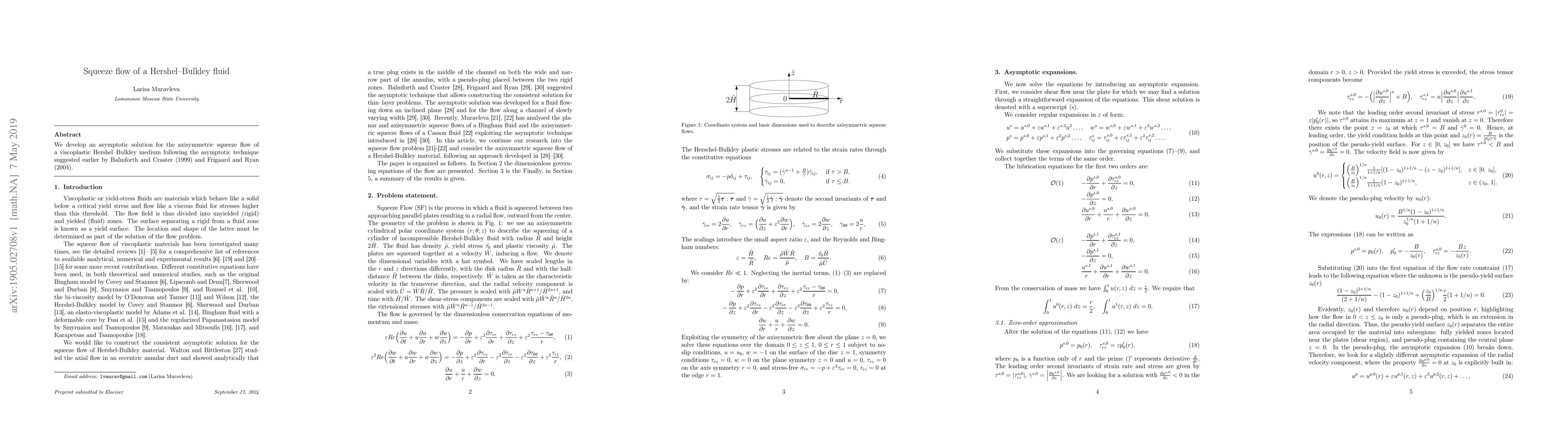 We develop an asymptotic solution for the axisymmetric squeeze flow of a viscoplastic Hershel--Bulkley medium following the asymptotic technique suggested earlier by Balmforth and Craster (1999) and Frigaard and Ryan (2004).