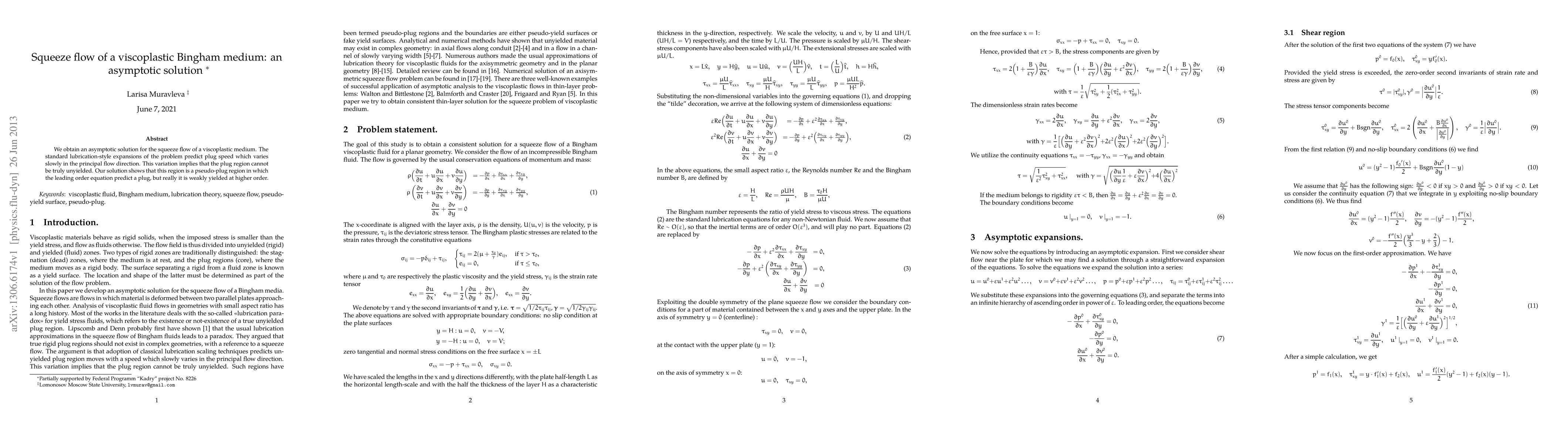 This paper presents an asymptotic solution for the squeeze flow of a viscoplastic Bingham medium, revealing that the plug region predicted by standard expansions is actually a pseudo-plug region where yielding occurs at higher order. This challenges the assumption of a fully unyielded plug region.