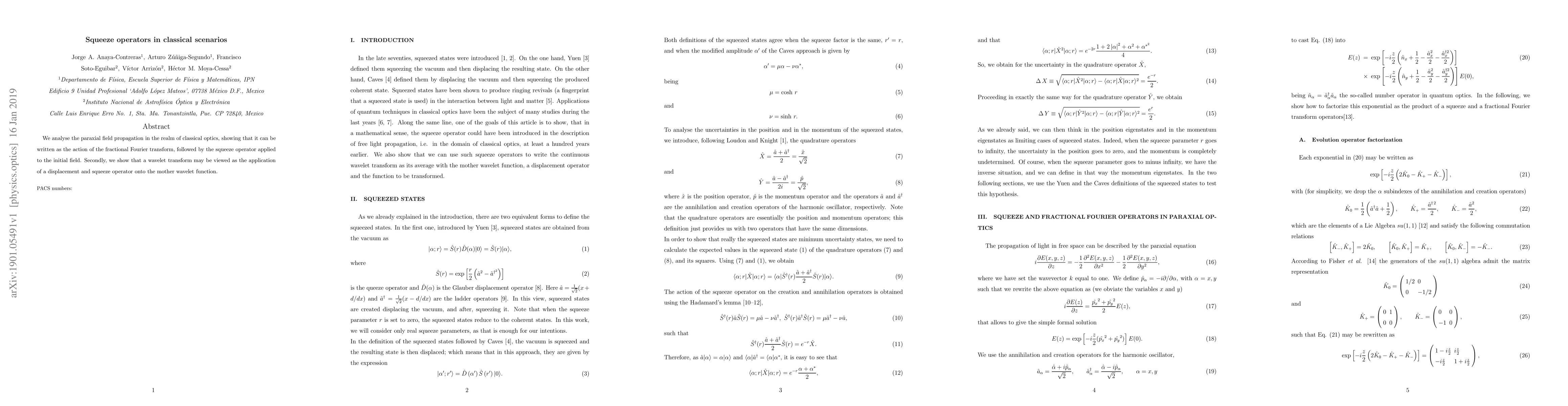 We analyse the paraxial field propagation in the realm of classical optics, showing that it can be written as the action of the fractional Fourier transform, followed by the squeeze operator applied to the initial field. Secondly, we show that a wavelet transform may be viewed as the application of a displacement and squeeze operator onto the mother wavelet function.