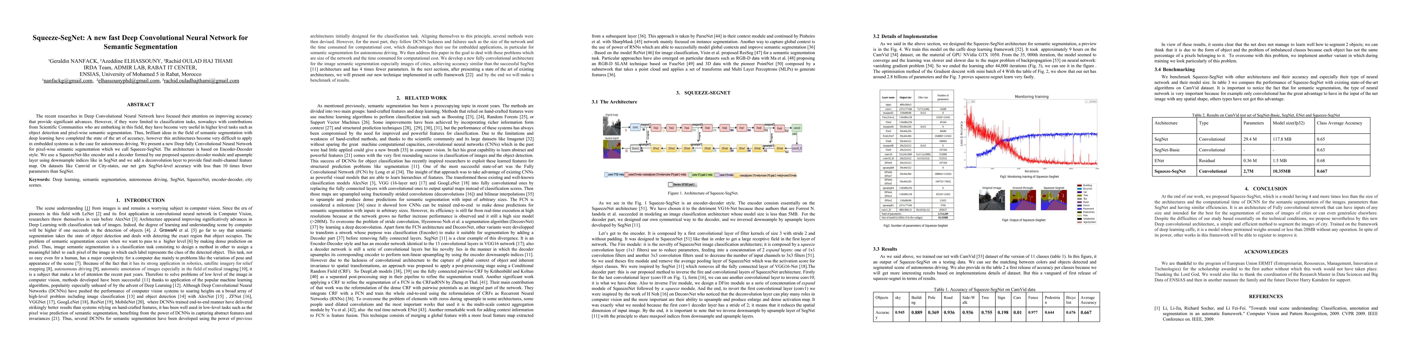 The recent researches in Deep Convolutional Neural Network have focused their attention on improving accuracy that provide significant advances. However, if they were limited to classification tasks, nowadays with contributions from Scientific Communities who are embarking in this field, they have become very useful in higher level tasks such as object detection and pixel-wise semantic segmentation. Thus, brilliant ideas in the field of semantic segmentation with deep learning have completed the state of the art of accuracy, however this architectures become very difficult to apply in embedded systems as is the case for autonomous driving. We present a new Deep fully Convolutional Neural Network for pixel-wise semantic segmentation which we call Squeeze-SegNet. The architecture is based on Encoder-Decoder style. We use a SqueezeNet-like encoder and a decoder formed by our proposed squeeze-decoder module and upsample layer using downsample indices like in SegNet and we add a deconvolution layer to provide final multi-channel feature map. On datasets like Camvid or City-states, our net gets SegNet-level accuracy with less than 10 times fewer parameters than SegNet.