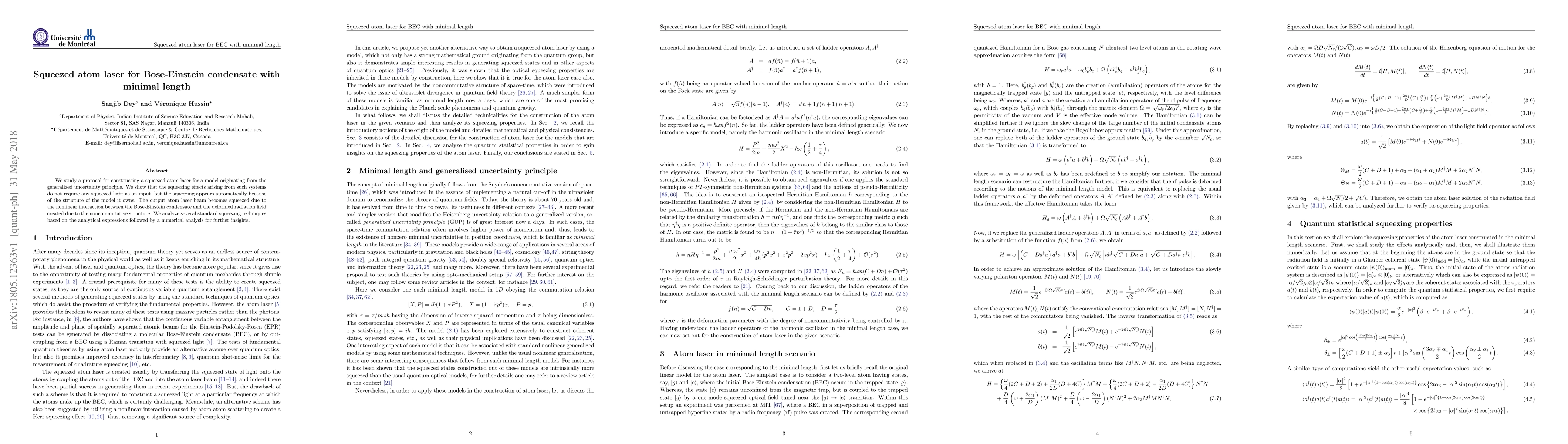 This paper proposes a method to construct a squeezed atom laser using a Bose-Einstein condensate influenced by the generalized uncertainty principle, demonstrating that squeezing occurs naturally without external squeezed light due to the model's inherent structure. The study combines analytical and numerical techniques to explore the nonlinear interactions leading to the squeezed output.