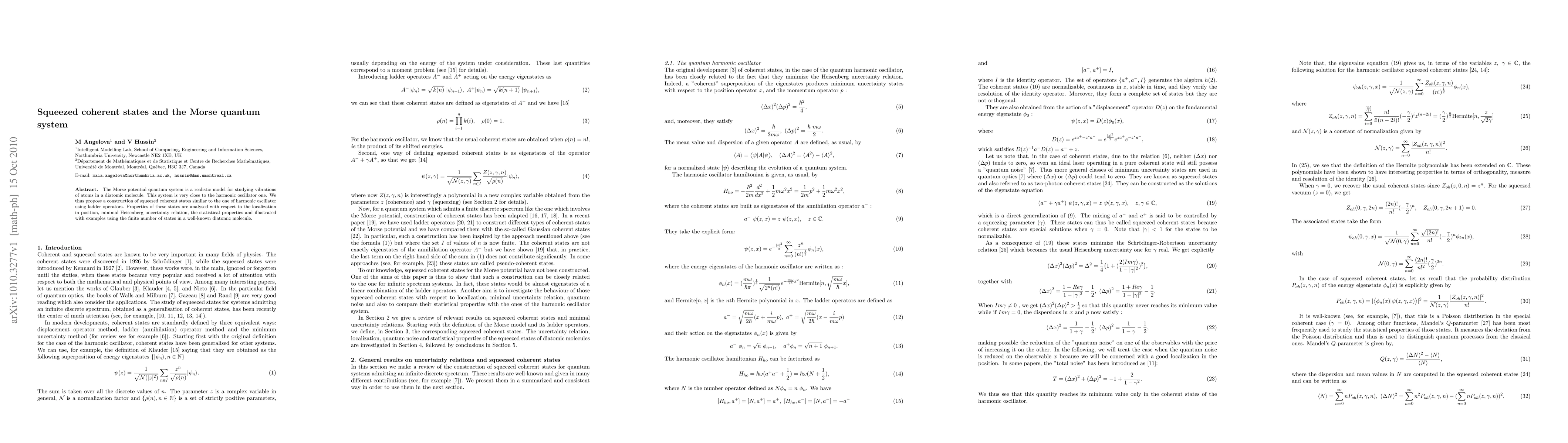 This paper constructs squeezed coherent states for the Morse quantum system, analogous to the harmonic oscillator, using ladder operators. It analyzes their properties, including localization, minimal uncertainty, and statistical features, and applies these concepts to a diatomic molecule.