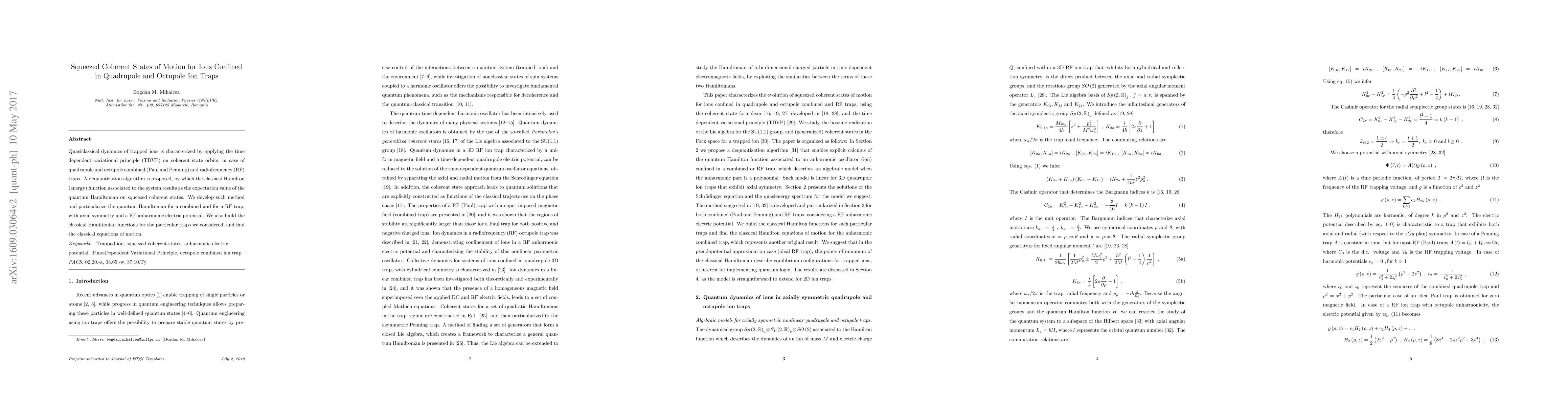 This paper explores quasiclassical dynamics of ions in quadrupole and octupole traps using squeezed coherent states, applying the time-dependent variational principle (TDVP). It proposes a dequantization algorithm to derive classical Hamiltonians from quantum Hamiltonians on squeezed coherent states, and develops classical equations of motion for combined and radiofrequency traps.