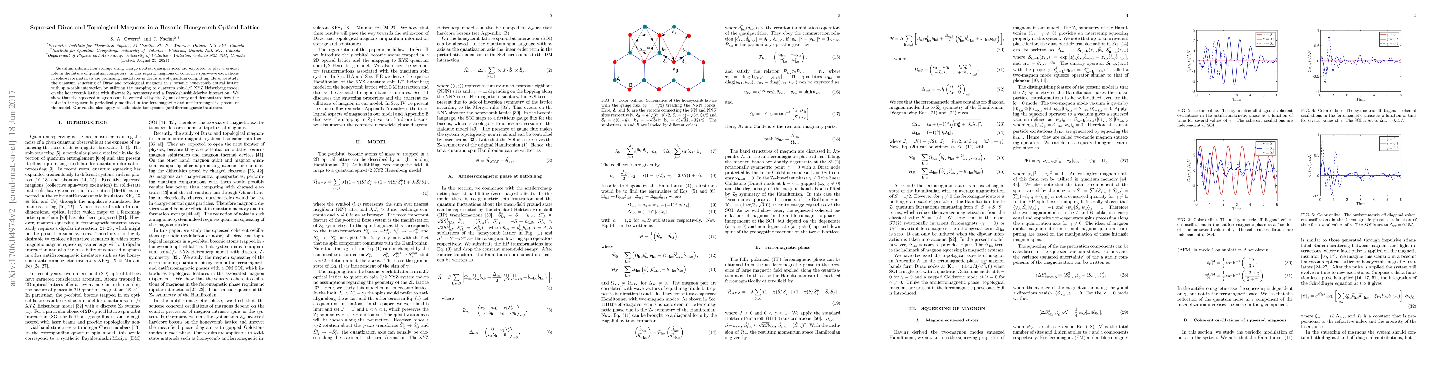 This paper investigates the quantum squeezing of Dirac and topological magnons in a bosonic honeycomb optical lattice, mapping it to a quantum spin-$1/2$ XYZ Heisenberg model. The study demonstrates control over squeezed magnons via Z$_2$ anisotropy and reveals periodic noise modulation in the ferromagnetic and antiferromagnetic phases, with implications for quantum information storage in solid-state materials.