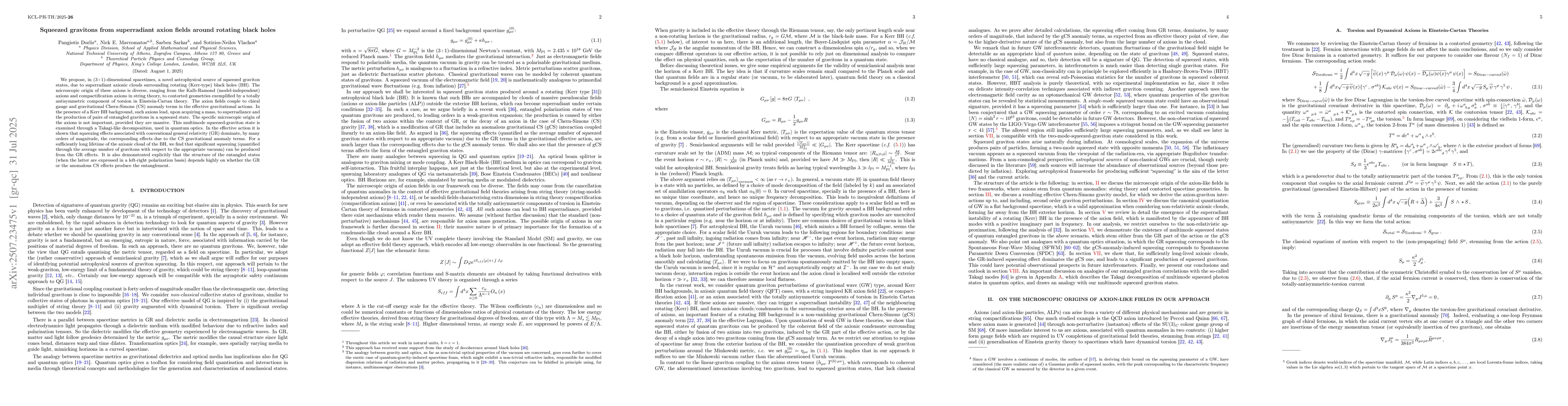 We propose, in (3+1)-dimensional spacetimes, a novel astrophysical source of squeezed graviton states, due to superradiant axionic clouds surrounding rotating (Kerr-type) black holes (BH). The microscopic origin of these axions is diverse, ranging from the Kalb-Ramond (model-independent) axions and compactification axions in string theory, to \cm contorted geometries exemplified by a totally antisymmetric component of torsion in Einstein-Cartan theory. The axion fields couple to chiral gauge and gravitational Chern-Simons (CS) anomaly terms in the effective gravitational actions. In the presence of a Kerr BH background, such axions lead, upon acquiring a mass, to superradiance and the production of pairs of entangled gravitons in a squeezed state. The specific microscopic origin of the axions is not important, provided they are massive. This multimode squeezed-graviton state is examined through a Takagi-like decomposition, used in quantum optics. In the effective action it is shown that squeezing effects associated with conventional general relativity (GR) dominate, by many orders of magnitude, the corresponding effects due to the CS gravitational anomaly terms. For a sufficiently long lifetime of the axionic cloud of the BH, we find that significant squeezing (quantified through the average number of gravitons with respect to the appropriate vacuum) can be produced from the GR effects. It is also demonstrated explicitly that the structure of the entangled states (when the latter are expressed in a left-right polarization basis) depends highly on whether the GR or the anomalous CS effects produce the entanglement.