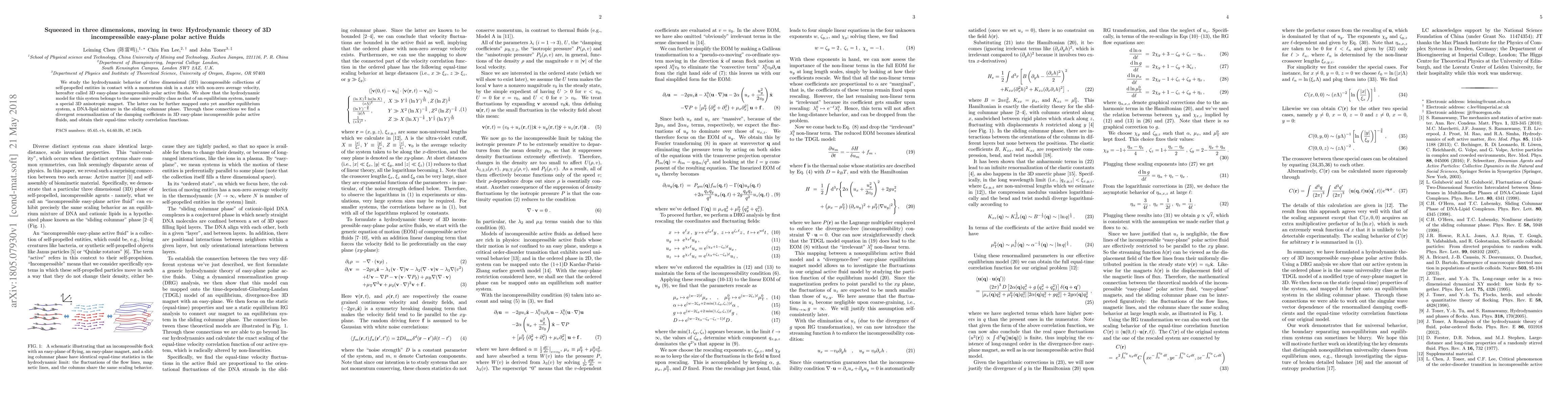 This research investigates the hydrodynamic behavior of 3D incompressible active fluids, showing they belong to the same universality class as a special 3D anisotropic magnet and a DNA-lipid mixture in the sliding columnar phase. It finds a divergent renormalization of damping coefficients and derives the equal-time velocity correlation functions.