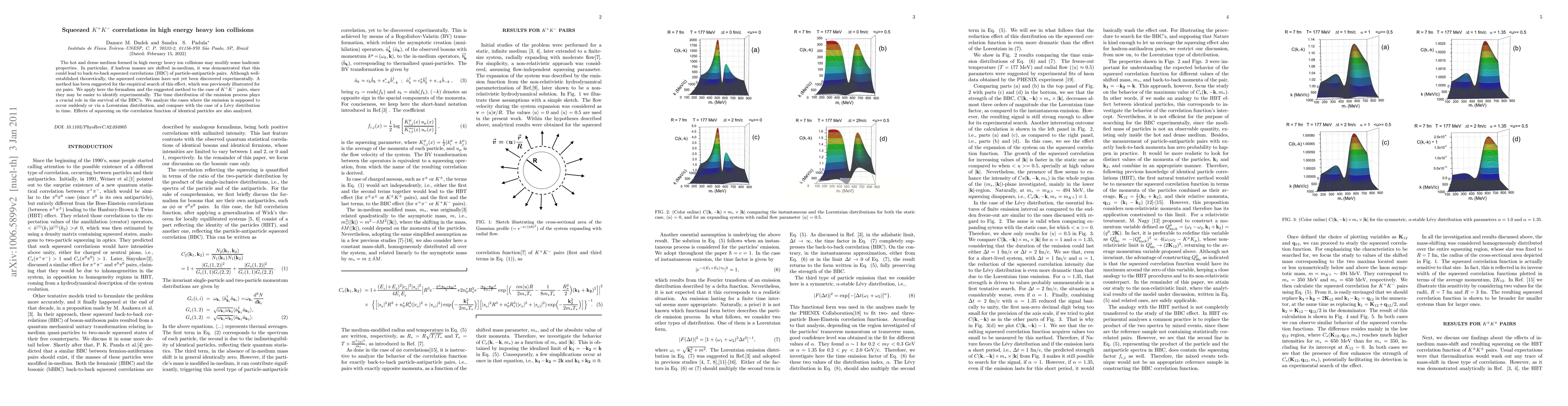 The hot and dense medium formed in high energy heavy ion collisions may modify some hadronic properties. In particular, if hadron masses are shifted in-medium, it was demonstrated that this could lead to back-to-back squeezed correlations (BBC) of particle-antiparticle pairs. Although well-established theoretically, the squeezed correlations have not yet been discovered experimentally. A method has been suggested for the empirical search of this effect, which was previously illustrated for phi-phi pairs. We apply here the formalism and the suggested method to the case of K^+ K^- pairs, since they may be easier to identify experimentally. The time distribution of the emission process plays a crucial role in the survival of the BBC's. We analyze the cases where the emission is supposed to occur suddenly or via a Lorentzian distribution, and compare with the case of a Levy distribution in time. Effects of squeezing on the correlation function of identical particles are also analyzed.