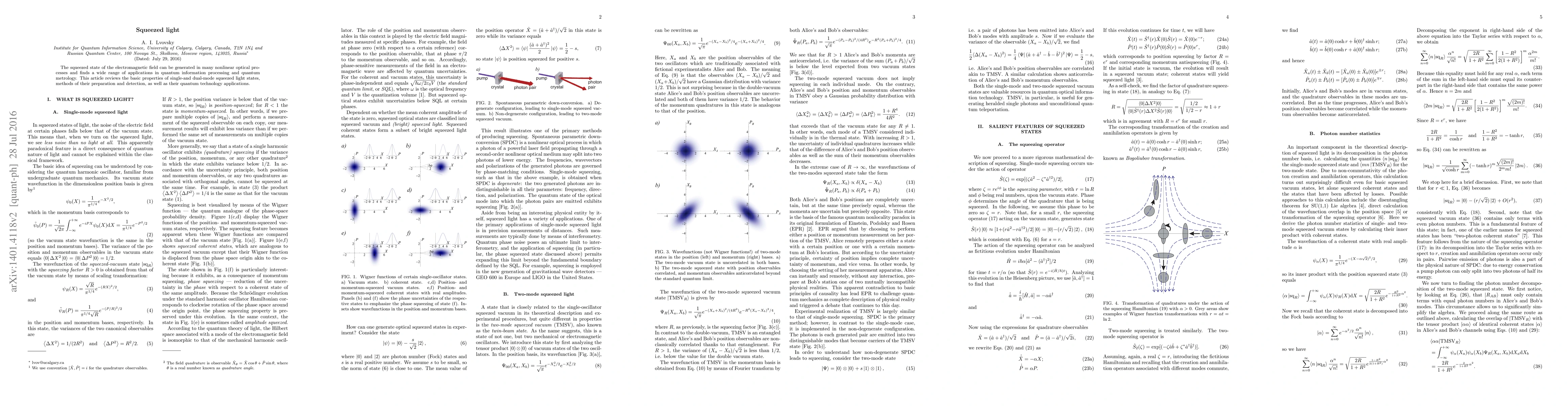 The squeezed state of the electromagnetic field can be generated in many nonlinear optical processes and finds a wide range of applications in quantum information processing and quantum metrology. This article reviews the basic properties of single-and dual-mode squeezed light states, methods of their preparation and detection, as well as their quantum technology applications.