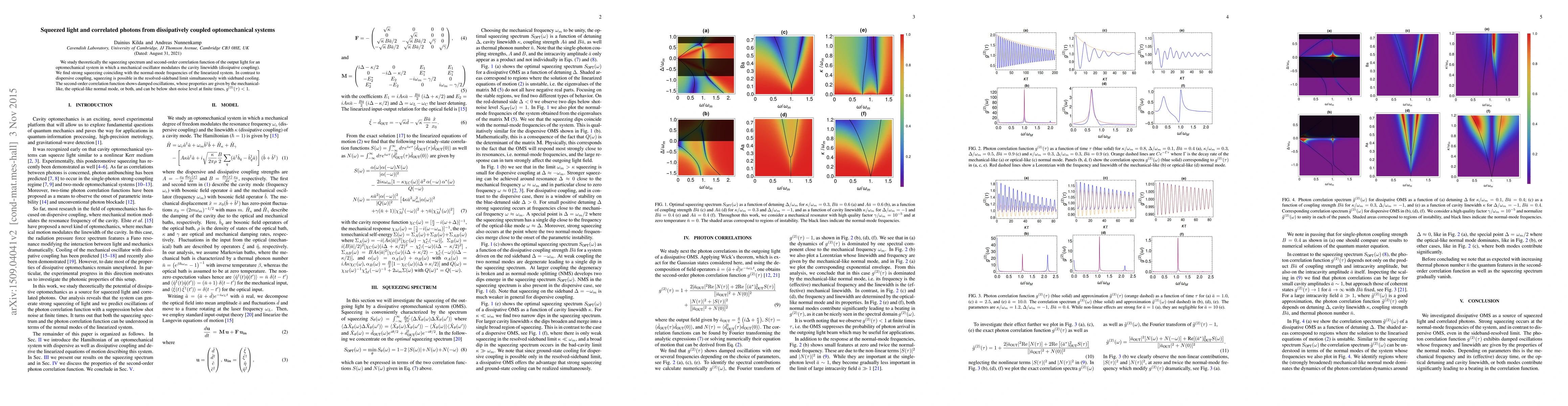 We study theoretically the squeezing spectrum and second-order correlation function of the output light for an optomechanical system in which a mechanical oscillator modulates the cavity linewidth (dissipative coupling). We find strong squeezing coinciding with the normal-mode frequencies of the linearized system. In contrast to dispersive coupling, squeezing is possible in the resolved-sideband limit simultaneously with sideband cooling. The second-order correlation function shows damped oscillations, whose properties are given by the mechanical-like, the optical-like normal mode, or both, and can be below shot-noise level at finite times, $g^{(2)} (\tau) < 1$.