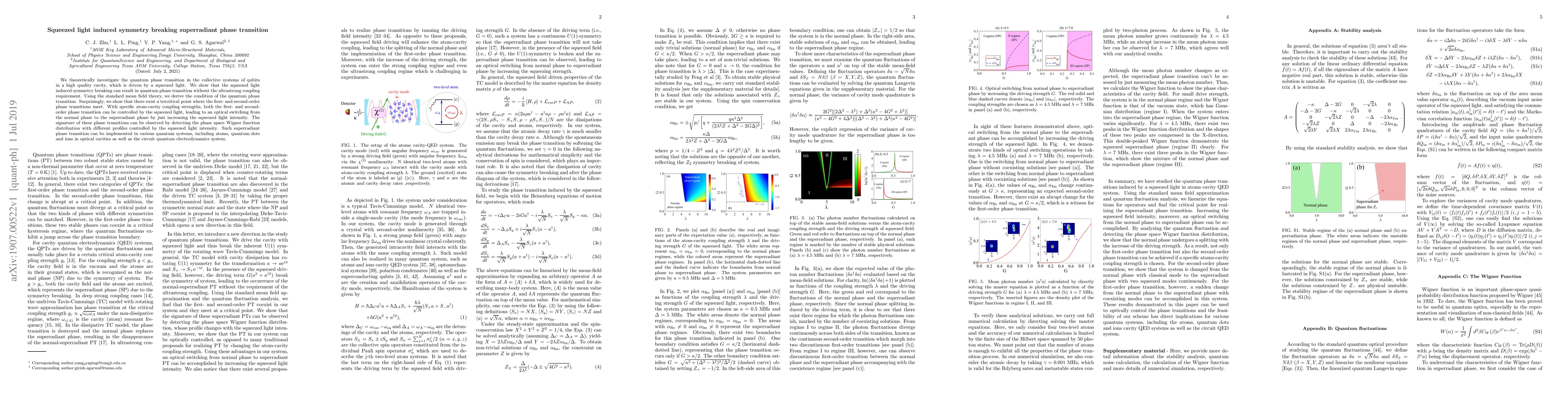 We theoretically investigate the quantum phase transition in the collective systems of qubits in a high-quality cavity, which is driven by a squeezed light. We show that the squeezed light induced symmetry breaking can result in quantum phase transition without the ultrastrong coupling requirement. Using the standard mean field theory, we derive the condition of the quantum phase transition. Surprisingly, we show that there exists a tricritical point where the first- and second-order phase transitions meet. With specific atom-cavity coupling strengths, both the first- and second-order phase transition can be controlled by the squeezed light, leading to an optical switching from the normal phase to the superradiant phase by just increasing the squeezed light intensity. The signature of these phase transitions can be observed by detecting the phase space Wigner function distribution with different profiles controlled by the squeezed light intensity. Such superradiant phase transition can be implemented in various quantum systems, including atoms, quantum dots and ions in optical cavities as well as the circuit quantum electrodynamics system.