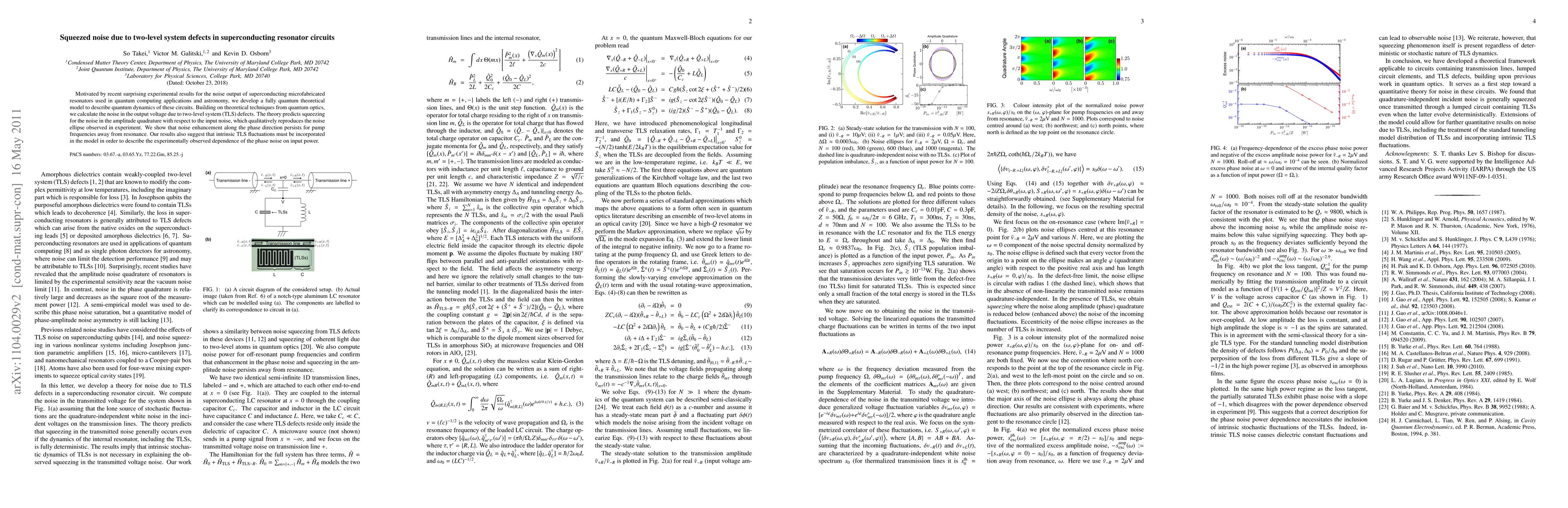 This paper develops a quantum theoretical model to explain the noise dynamics in superconducting resonator circuits, attributing noise enhancement to two-level system defects. The model predicts noise squeezing in the amplitude quadrature and explains the observed noise ellipse and phase noise dependence on input power.