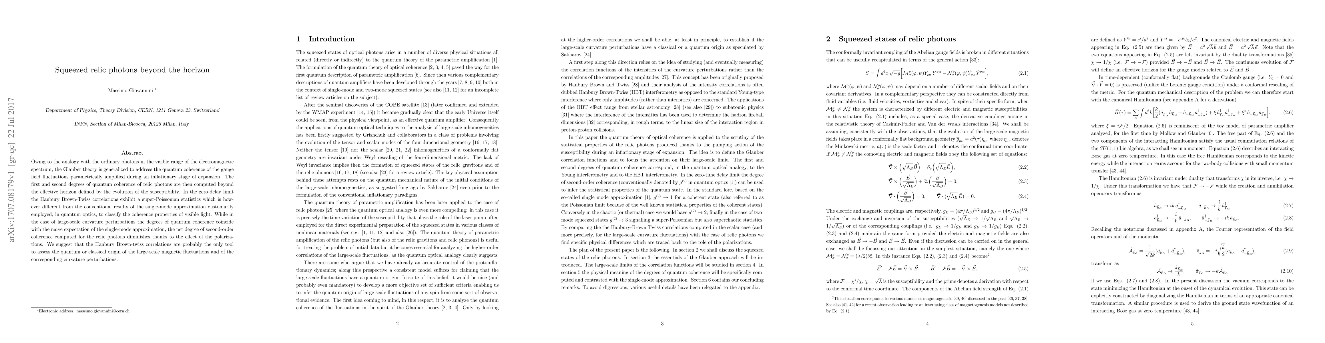 Owing to the analogy with the ordinary photons in the visible range of the electromagnetic spectrum, the Glauber theory is generalized to address the quantum coherence of the gauge field fluctuations parametrically amplified during an inflationary stage of expansion. The first and second degrees of quantum coherence of relic photons are then computed beyond the effective horizon defined by the evolution of the susceptibility. In the zero-delay limit the Hanbury Brown-Twiss correlations exhibit a super-Poissonian statistics which is however different from the conventional results of the single-mode approximation customarily employed, in quantum optics, to classify the coherence properties of visible light. While in the case of large-scale curvature perturbations the degrees of quantum coherence coincide with the naive expectation of the single-mode approximation, the net degree of second-order coherence computed for the relic photons diminishes thanks to the effect of the polarizations. We suggest that the Hanbury Brown-twiss correlations are probably the only tool to assess the quantum or classical origin of the large-scale magnetic fluctuations and of the corresponding curvature perturbations.